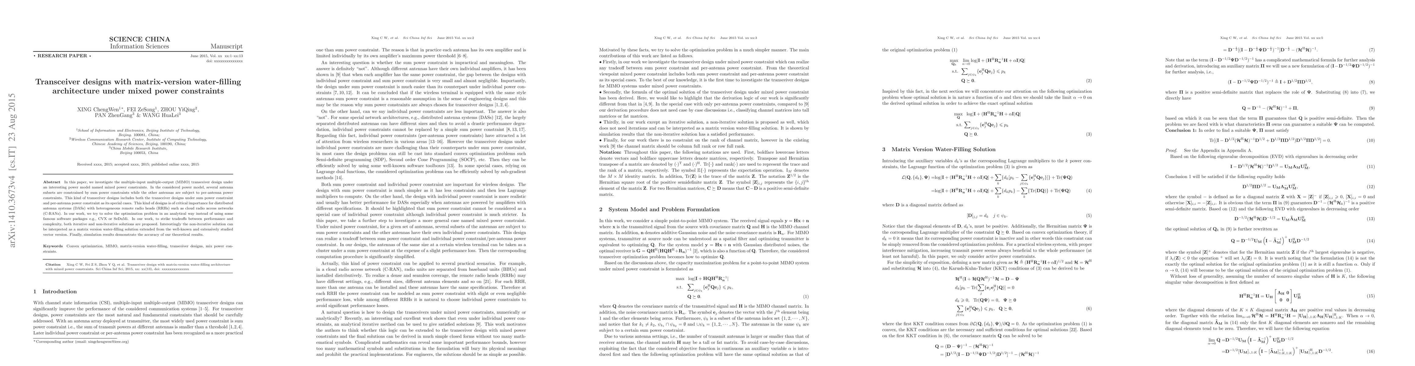 In this paper, we investigate the multiple-input multiple-output (MIMO) transceiver design under an interesting power model named mixed power constraints. In the considered power model, several antenna subsets are constrained by sum power constraints while the other antennas are subject to per-antenna power constraints. This kind of transceiver designs includes both the transceiver designs under sum power constraint and per-antenna power constraint as its special cases. This kind of designs is of critical importance for distributed antenna systems (DASs) with heterogeneous remote radio heads (RRHs) such as cloud radio access networks (C-RANs). In our work, we try to solve the optimization problem in an analytical way instead of using some famous software packages e.g., CVX or SeDuMi. In our work, to strike tradeoffs between performance and complexity, both iterative and non-iterative solutions are proposed. Interestingly the non-iterative solution can be interpreted as a matrix version water-filling solution extended from the well-known and extensively studied vector version. Finally, simulation results demonstrate the accuracy of our theoretical results.