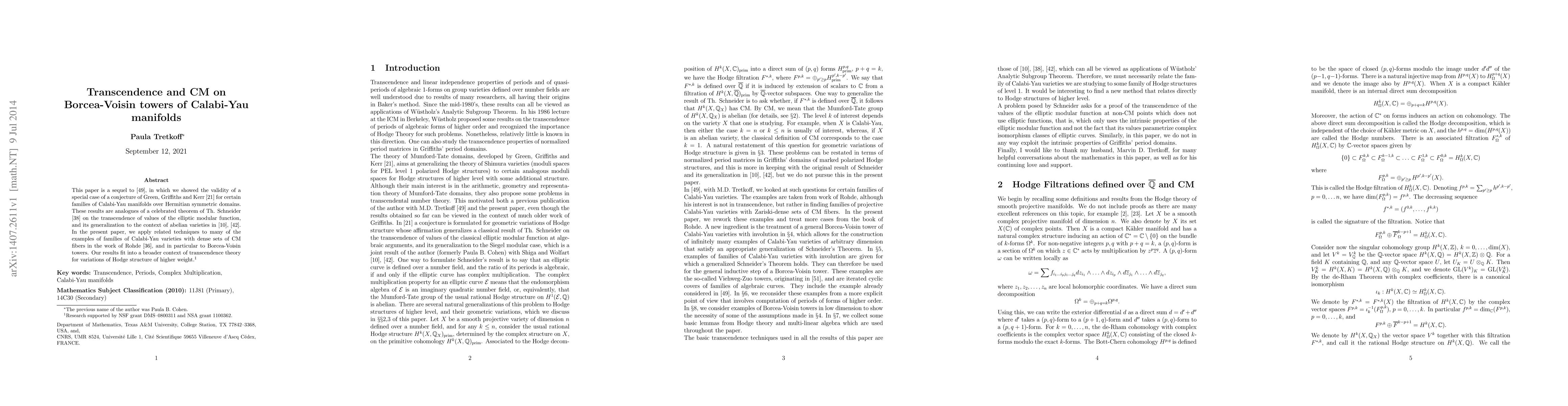 This paper extends previous work on the transcendence properties of certain Calabi-Yau manifolds, applying techniques to Borcea-Voisin towers with CM fibers, and contributing to the broader theory of transcendence in variations of Hodge structures.