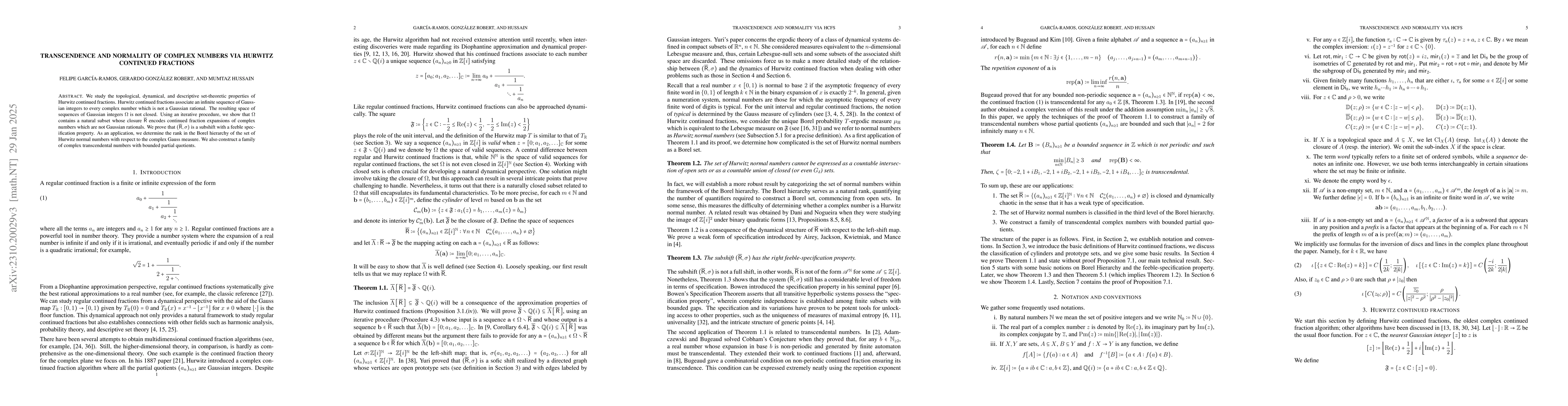 This paper explores the transcendence of complex numbers through Hurwitz continued fractions, demonstrating that a natural subset of the space of Gaussian integer sequences encodes continued fraction expansions of complex non-Gaussian rationals. It also proves that the closure of this subset is a subshift with a feeble specification property, determining its rank in the Borel hierarchy and constructing a family of complex transcendental numbers.