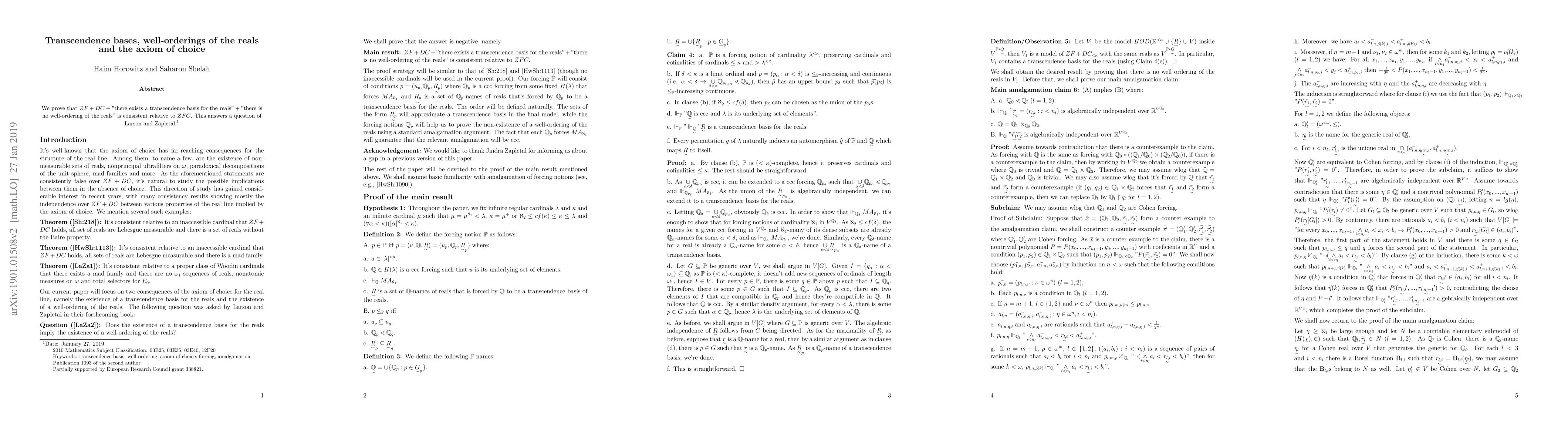 This paper demonstrates the relative consistency of $ZF+DC$ with the existence of a transcendence basis for the reals and the non-existence of a well-ordering of the reals, addressing a question posed by Larson and Zapletal. The result supports the independence of these statements from $ZFC$.