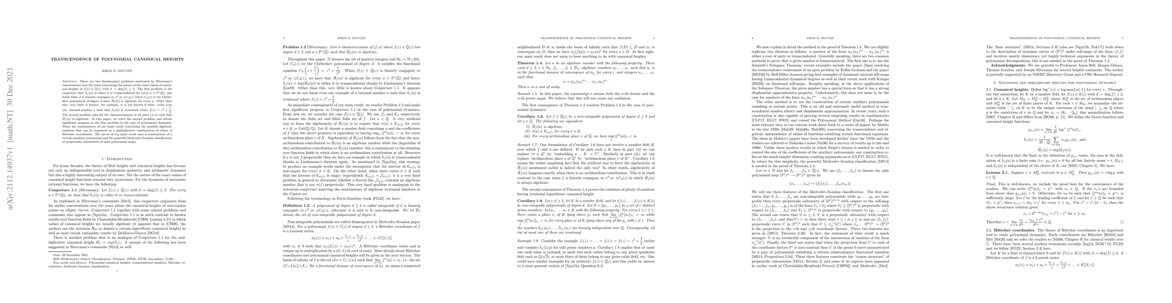 This paper solves the second problem in transcendental dynamics, characterizing pairs (f,a) where canonical height ¸H_f(a) is algebraic, making significant progress to the first problem regarding the nature of exact values of canonical heights for polynomials.