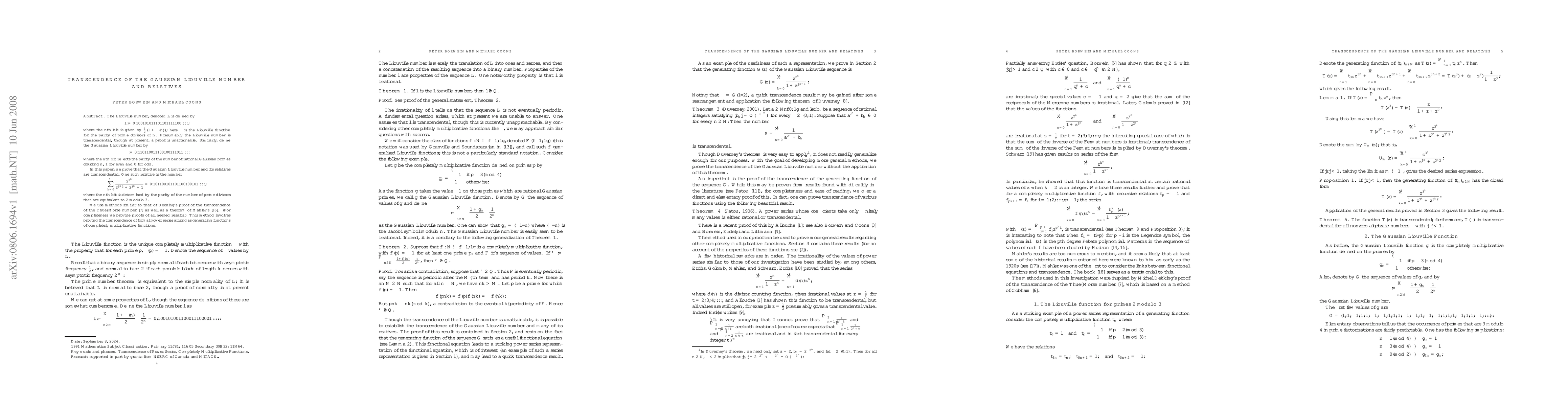 {\em The Liouville number}, denoted $l$, is defined by $$l:=0.100101011101101111100...,$$ where the $n$th bit is given by ${1/2}(1+\gl(n))$; here $\gl$ is the Liouville function for the parity of prime divisors of $n$. Presumably the Liouville number is transcendental, though at present, a proof is unattainable. Similarly, define {\em the Gaussian Liouville number} by $$\gamma:=0.110110011100100111011...$$ where the $n$th bit reflects the parity of the number of rational Gaussian primes dividing $n$, 1 for even and 0 for odd. In this paper, we prove that the Gaussian Liouville number and its relatives are transcendental. One such relative is the number $$\sum_{k=0}^\infty\frac{2^{3^k}}{2^{3^k2}+2^{3^k}+1}=0.101100101101100100101...,$$ where the $n$th bit is determined by the parity of the number of prime divisors that are equivalent to 2 modulo 3. We use methods similar to that of Dekking's proof of the transcendence of the Thue--Morse number \cite{Dek1} as well as a theorem of Mahler's \cite{Mahl1}. (For completeness we provide proofs of all needed results.) This method involves proving the transcendence of formal power series arising as generating functions of completely multiplicative functions.