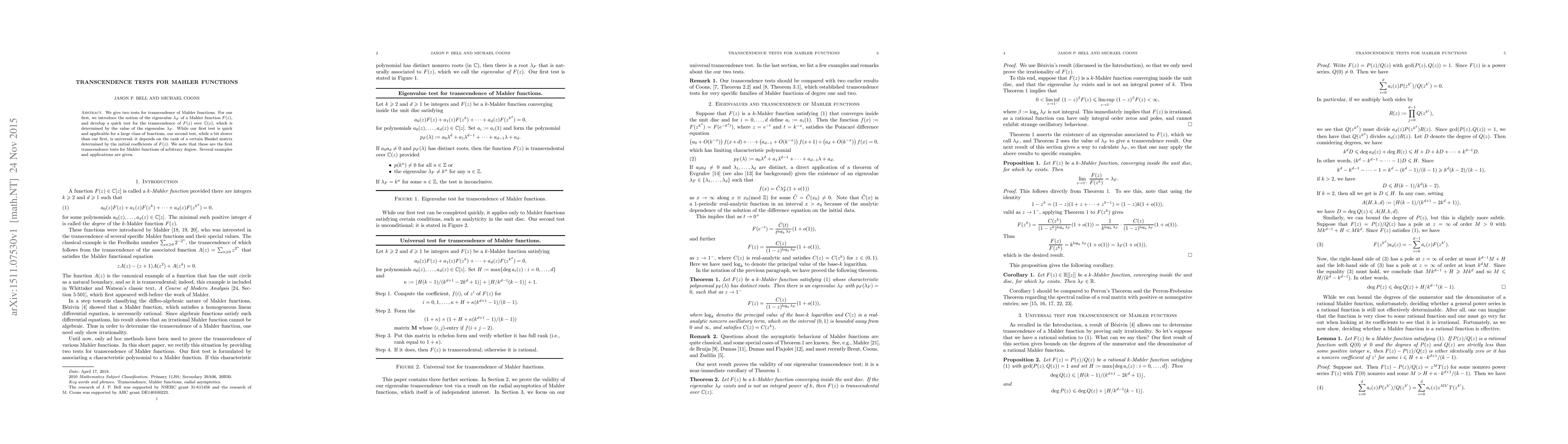 This paper presents two novel tests for determining the transcendence of Mahler functions. The first test uses the eigenvalue $\lambda_F$ of a Mahler function $F(z)$ for quick evaluation. The second test, though slower, is universal and relies on the rank of a Hankel matrix formed from the initial coefficients of $F(z)$. These are the first transcendence tests for Mahler functions of any degree.