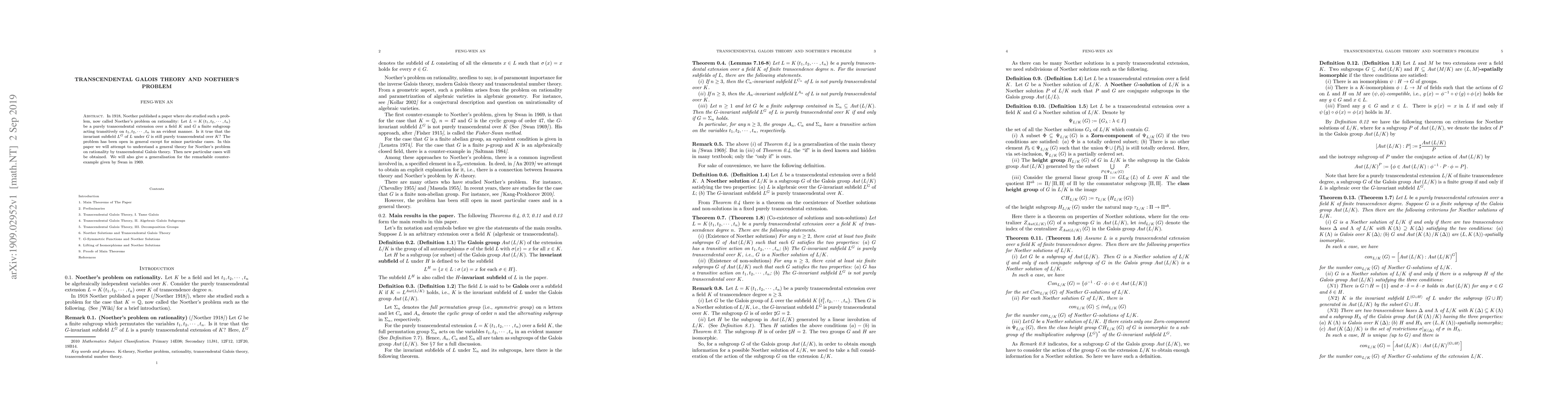 In 1918, Noether published a paper where she studied such a problem, now called Noether's problem on rationality: Let $L=K\left( t_{1},t_{2},\cdots ,t_{n}\right) $ be a purely transcendental extension over a field $K$ and $G$ a finite subgroup acting transitively on $t_{1},t_{2},\cdots ,t_{n}$ in an evident manner. Is it true that the invariant subfield $L^{G}$ of $L$ under $% G$ is still purely transcendental over $K$? The problem has been open in general except for minor particular cases. In this paper we will attempt to understand a general theory for Noether's problem on rationality by transcendental Galois theory. Then new particular cases will be obtained. We will also give a generalization for the remarkable counter-example given by Swan in 1969.