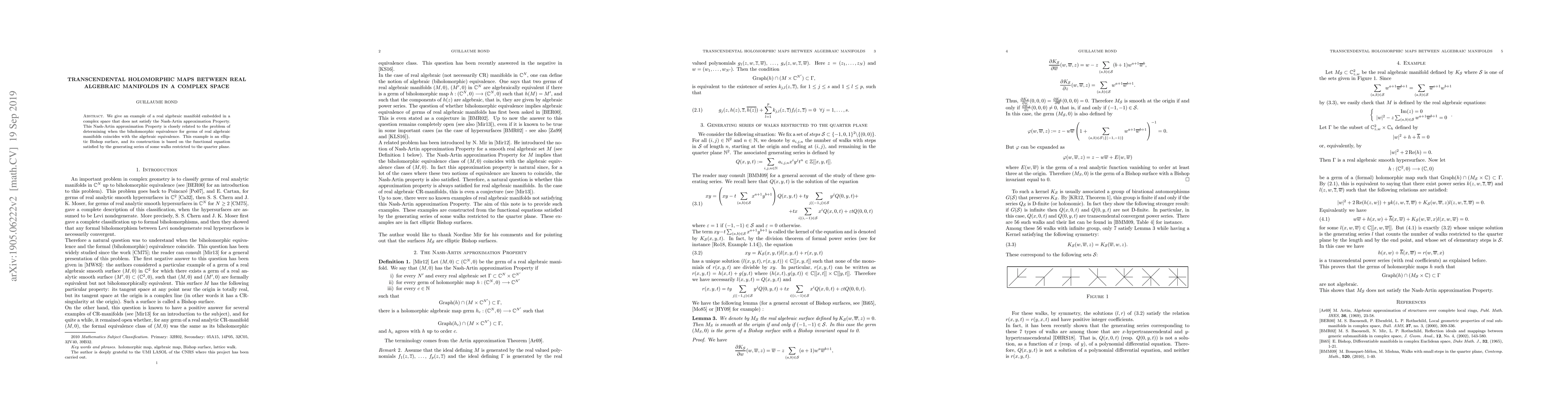 We give an example of a real algebraic manifold embedded in a complex space that does not satisfy the Nash-Artin approximation Property. This Nash-Artin approximation Property is closely related to the problem of determining when the biholomorphic equivalence for germs of real algebraic manifolds coincides with the algebraic equivalence. This example is an elliptic Bishop surface, and its construction is based on the functional equation satisfied by the generating series of some walks restricted to the quarter plane.