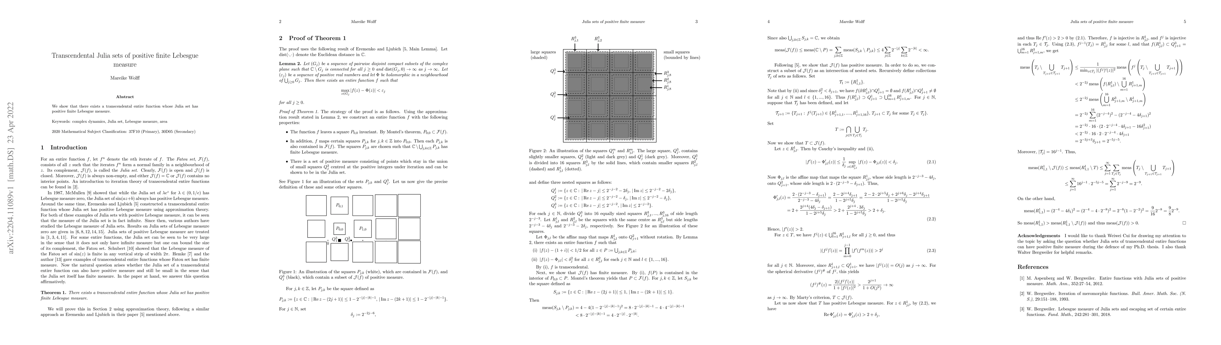 Researchers have found a transcendental entire function whose Julia set has positive finite Lebesgue measure, providing evidence of such an example's existence.