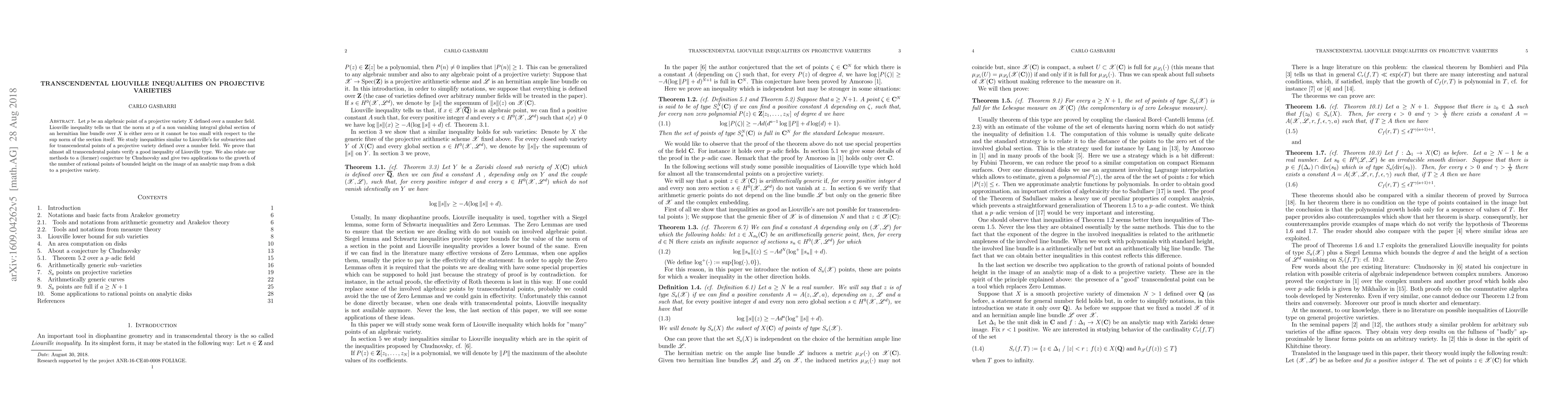 Let $p$ be an algebraic point of a projective variety $X$ defined over a number field. Liouville inequality tells us that the norm at $p$ of a non vanishing integral global section of an hermitian line bundle over $X$ is either zero or it cannot be too small with respect to the $\sup$ norm of the section itself. We study inequalities similar to Liouville's for subvarietes and for transcendental points of a projective variety defined over a number field. We prove that almost all transcendental points verify a good inequality of Liouville type. We also relate our methods to a (former) conjecture by Chudnowsky and give two applications to the growth of the number of rational points of bounded height on the image of an analytic map from a disk to a projective variety.