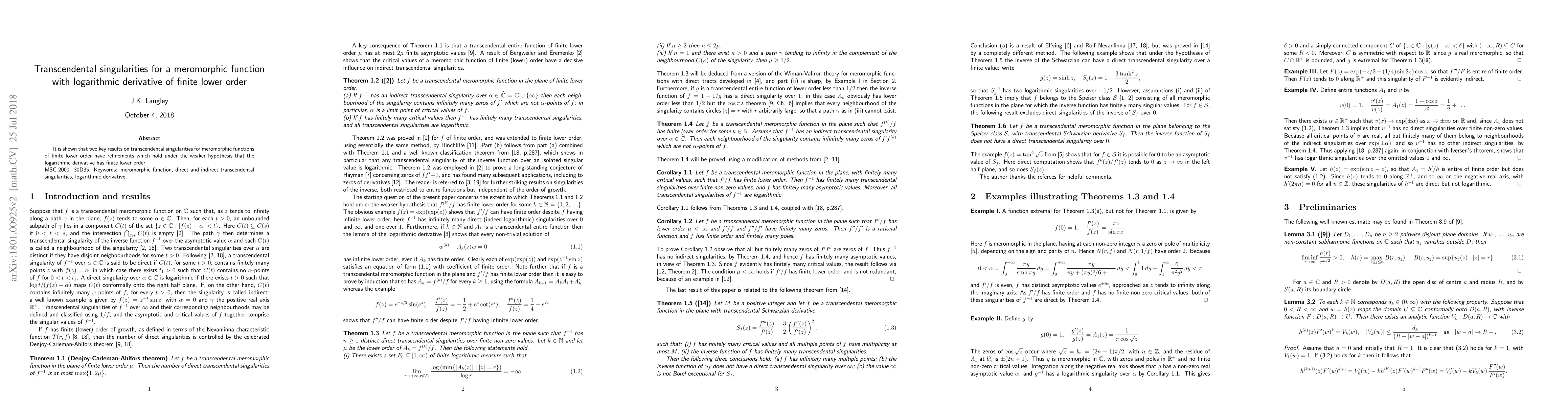 Summary: This paper refines two established results on transcendental singularities for meromorphic functions, showing that they still hold when the logarithmic derivative of the function has finite lower order, rather than requiring the function itself to have finite lower order.