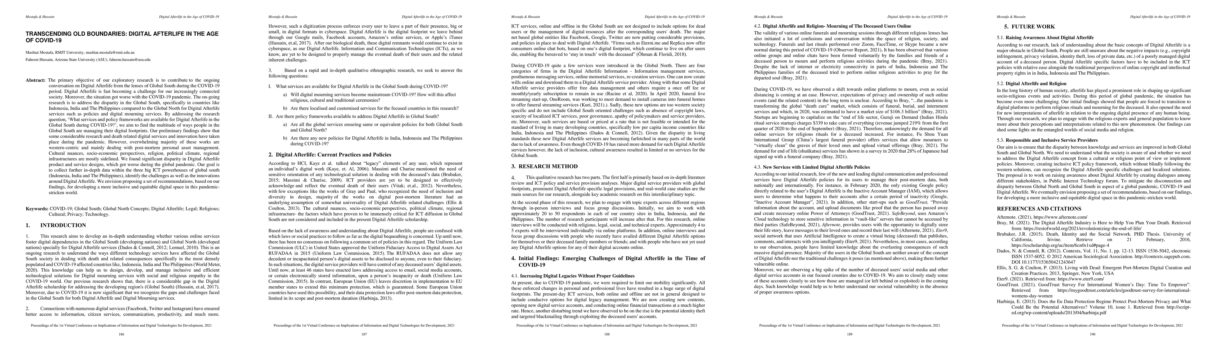 The primary objective of our exploratory research is to contribute to the ongoing conversation on Digital Afterlife from the lenses of Global South during the COVID-19 period. Digital Afterlife is fast becoming a challenge for our increasingly connected society. Moreover, the situation got worse with the COVID-19 pandemic. The on-going research is to address the disparity in the Global South, specifically in countries like Indonesia, India and The Philippines compared to the Global North for Digital Afterlife services such as policies and digital mourning services. By addressing the research question, 'What services and policy frameworks are available for Digital Afterlife in the Global South during COVID-19?', we aim to find the multitude of ways people in the Global South are managing their digital footprints. Our preliminary findings show that some considerable research and death related digital services and innovation have taken place during the pandemic. However, overwhelming majority of these works are western-centric and mainly dealing with post-mortem personal asset management. Cultural nuances, socio-economic perspectives, religion, political climate, regional infrastructures are mostly sidelined. We found significant disparity in Digital Afterlife product and service designs, which got worse during the global pandemic. Our goal is to collect further in-depth data within the three big ICT powerhouses of global south (Indonesia, India and The Philippines), identify the challenges as well as the innovations around Digital Afterlife.We envision proposing a set of recommendations, based on our findings, for developing a more inclusive and equitable digital space in this pandemic-stricken world.