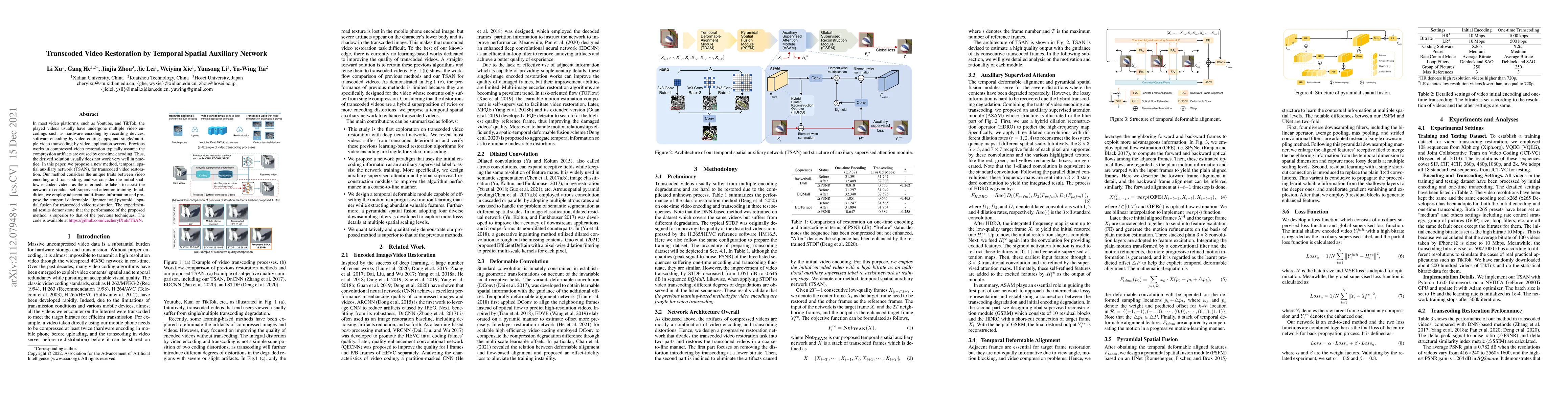 This paper proposes a temporal spatial auxiliary network (TSAN) for restoring transcoded videos, addressing the limitations of previous methods that assume single-time encoding. TSAN leverages initial shallow encoded videos as intermediate labels and uses temporal deformable alignment and pyramidal spatial fusion to achieve superior restoration performance compared to existing techniques.