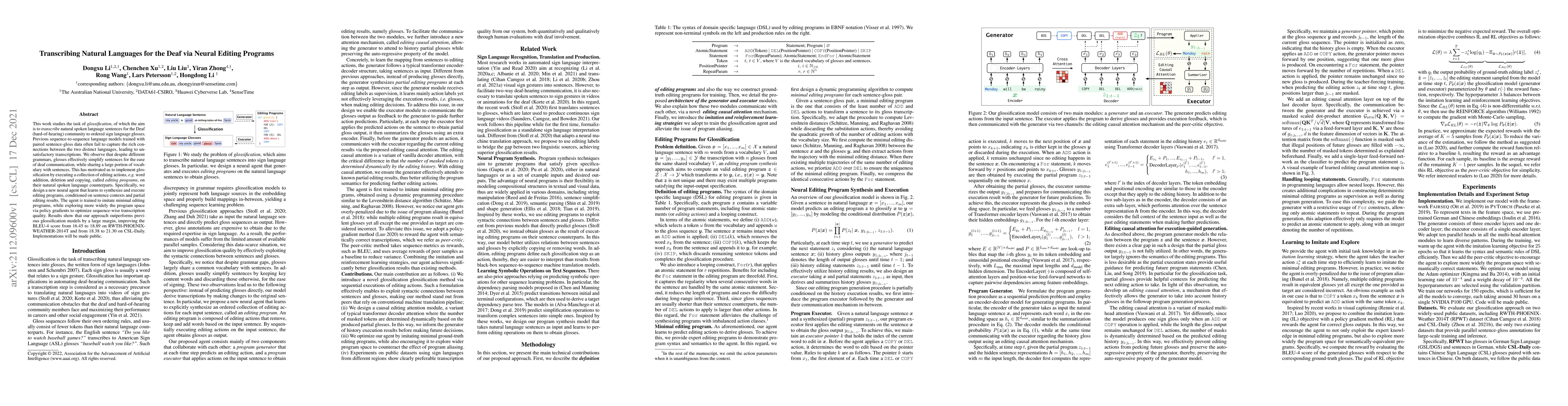 This work studies the task of glossification, of which the aim is to em transcribe natural spoken language sentences for the Deaf (hard-of-hearing) community to ordered sign language glosses. Previous sequence-to-sequence language models trained with paired sentence-gloss data often fail to capture the rich connections between the two distinct languages, leading to unsatisfactory transcriptions. We observe that despite different grammars, glosses effectively simplify sentences for the ease of deaf communication, while sharing a large portion of vocabulary with sentences. This has motivated us to implement glossification by executing a collection of editing actions, e.g. word addition, deletion, and copying, called editing programs, on their natural spoken language counterparts. Specifically, we design a new neural agent that learns to synthesize and execute editing programs, conditioned on sentence contexts and partial editing results. The agent is trained to imitate minimal editing programs, while exploring more widely the program space via policy gradients to optimize sequence-wise transcription quality. Results show that our approach outperforms previous glossification models by a large margin.