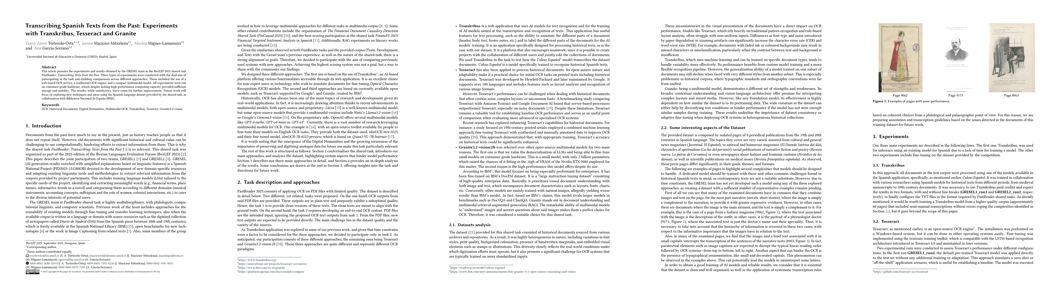 This article presents the experiments and results obtained by the GRESEL team in the IberLEF 2025 shared task PastReader: Transcribing Texts from the Past. Three types of experiments were conducted with the dual aim of participating in the task and enabling comparisons across different approaches. These included the use of a web-based OCR service, a traditional OCR engine, and a compact multimodal model. All experiments were run on consumer-grade hardware, which, despite lacking high-performance computing capacity, provided sufficient storage and stability. The results, while satisfactory, leave room for further improvement. Future work will focus on exploring new techniques and ideas using the Spanish-language dataset provided by the shared task, in collaboration with Biblioteca Nacional de Espa\~na (BNE).
