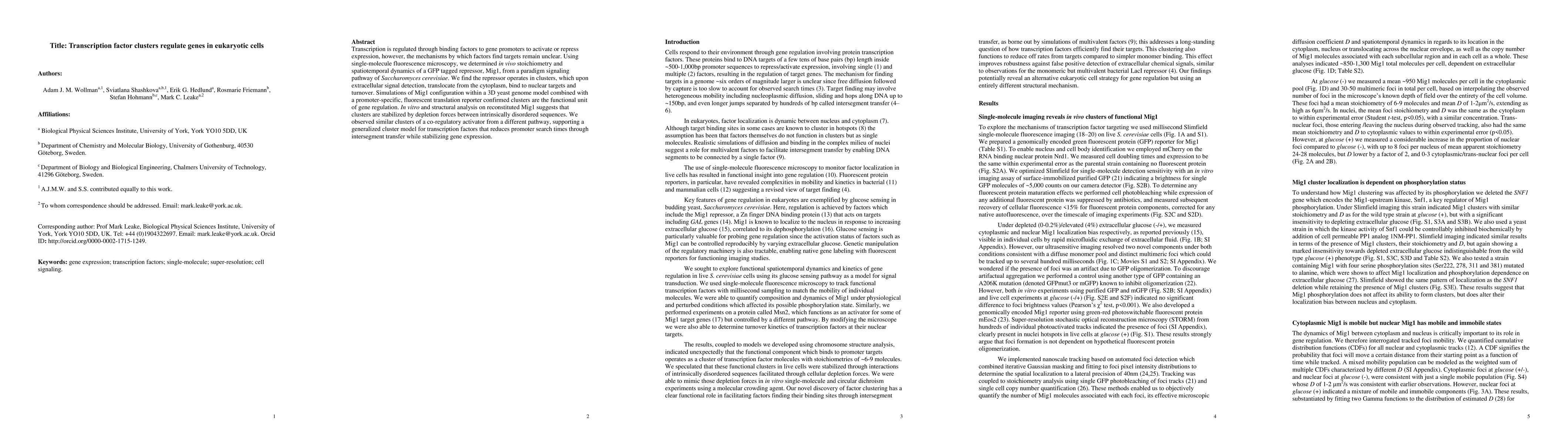 This paper reveals that transcription factor clusters, specifically the repressor Mig1, operate in a coordinated manner in eukaryotic cells to regulate gene expression. Using advanced microscopy and simulations, researchers found that these clusters, stabilized by depletion forces, enhance the efficiency of gene regulation by reducing search times and maintaining expression stability.