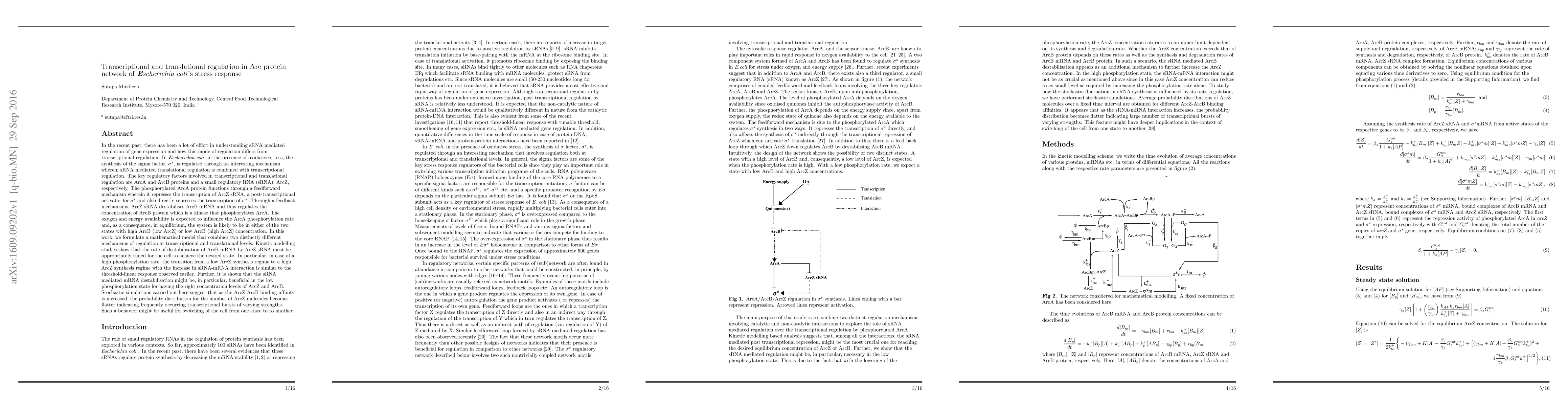 This paper investigates the dual transcriptional and translational regulation mechanisms in Escherichia coli's Arc protein network, focusing on the role of ArcA, ArcB, and ArcZ sRNA in managing oxidative stress. It highlights how ArcZ sRNA destabilizes ArcB mRNA, influencing the phosphorylation rate of ArcA and thus the stress response.
