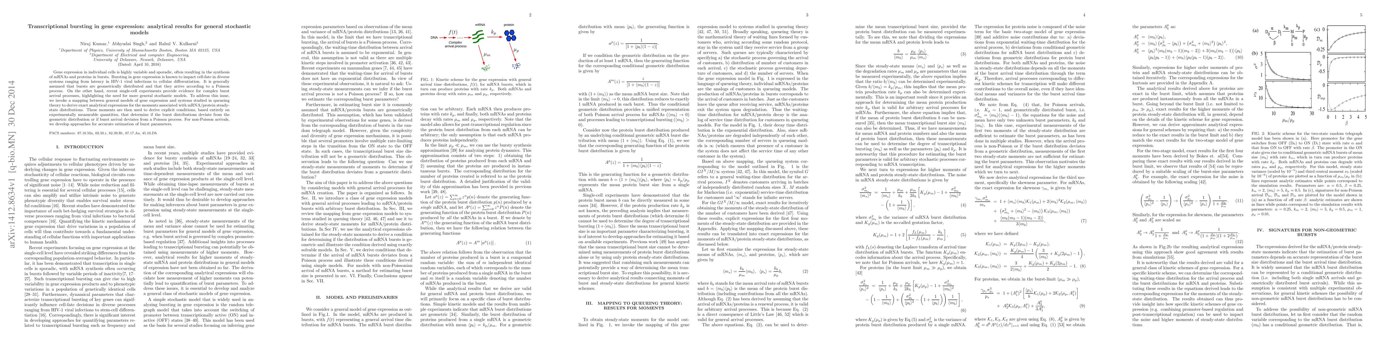 This paper develops analytical expressions for general stochastic models of transcriptional bursting in gene expression, providing conditions to determine deviations from geometric distributions and Poisson arrival processes. It also offers methods for estimating burst parameters when arrivals are non-Poisson.