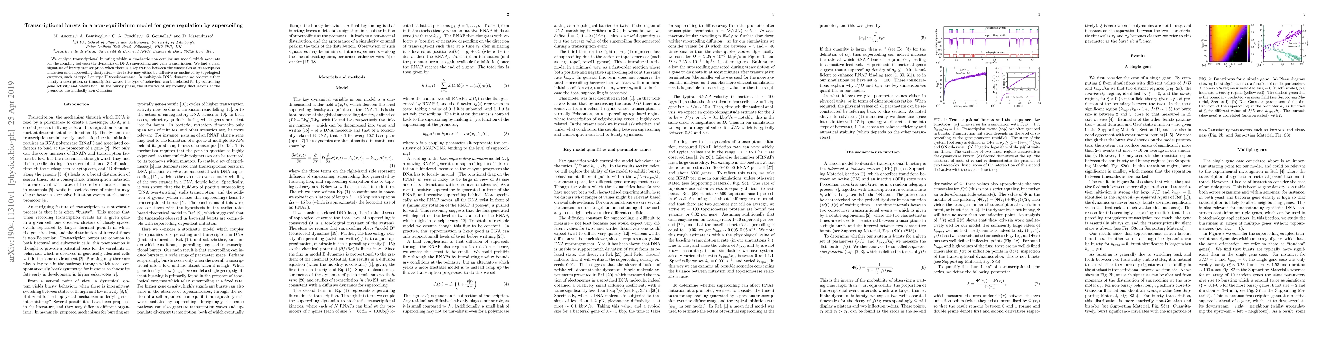 This research examines transcriptional bursting in a stochastic non-equilibrium model that links DNA supercoiling dynamics to gene transcription, identifying bursty transcription when transcription initiation and supercoiling dissipation have distinct timescales. It also shows how gene activity and orientation can influence whether transcription exhibits bursty or wave-like behavior.