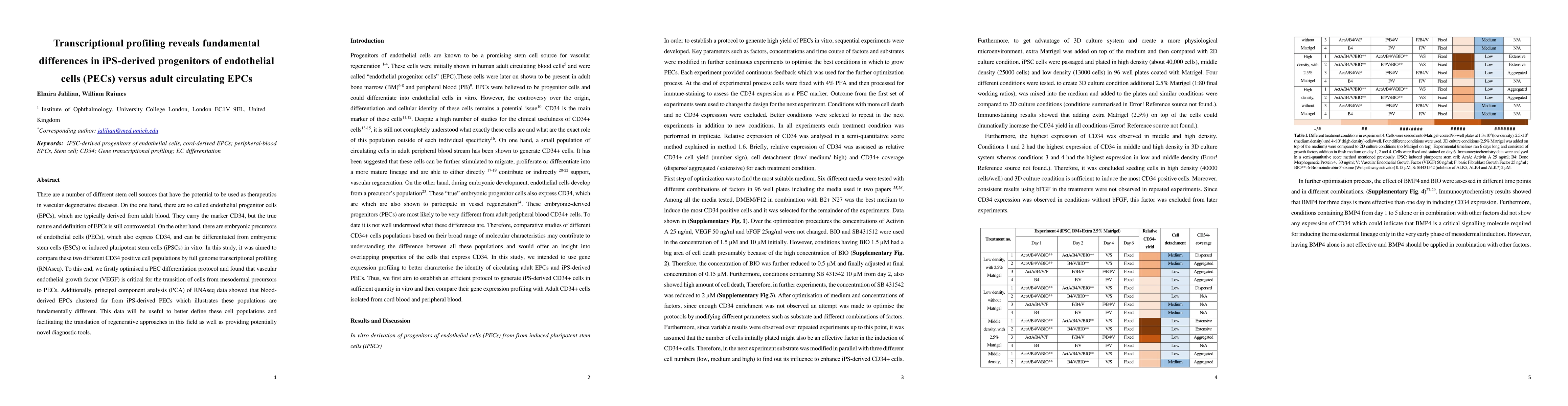 This study compares the transcriptional profiles of iPS-derived endothelial precursors (PECs) and adult blood-derived endothelial progenitor cells (EPCs) using RNAseq, revealing fundamental differences between the two CD34-positive populations. The findings suggest distinct natures of these cells, which could aid in refining their definitions and improving regenerative therapies.