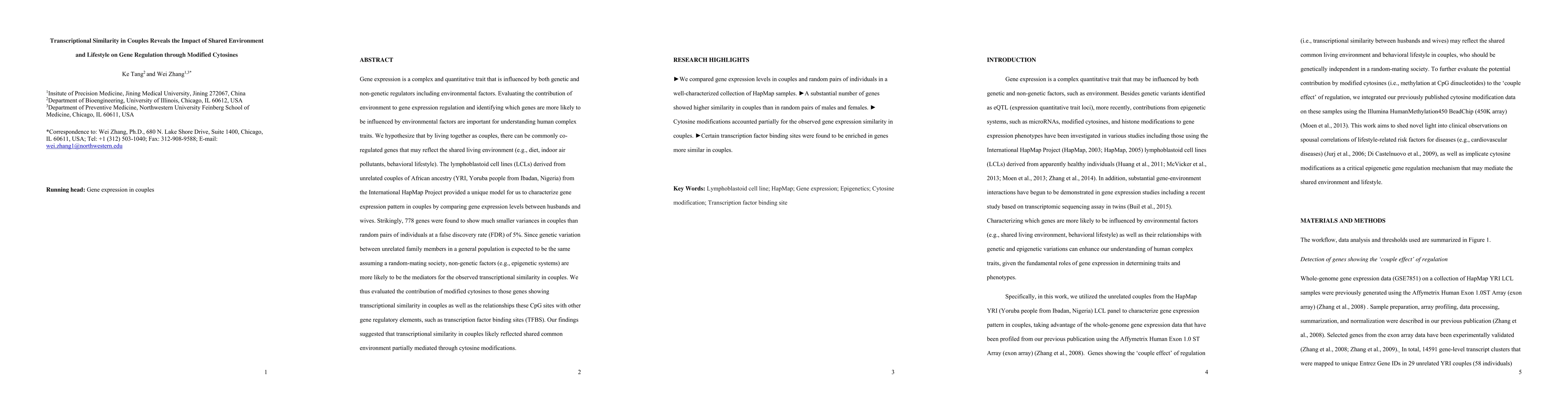 Gene expression is a complex and quantitative trait that is influenced by both genetic and non-genetic regulators including environmental factors. Evaluating the contribution of environment to gene expression regulation and identifying which genes are more likely to be influenced by environmental factors are important for understanding human complex traits. We hypothesize that by living together as couples, there can be commonly co-regulated genes that may reflect the shared living environment (e.g., diet, indoor air pollutants, behavioral lifestyle). The lymphoblastoid cell lines (LCLs) derived from unrelated couples of African ancestry (YRI, Yoruba people from Ibadan, Nigeria) from the International HapMap Project provided a unique model for us to characterize gene expression pattern in couples by comparing gene expression levels between husbands and wives. Strikingly, 778 genes were found to show much smaller variances in couples than random pairs of individuals at a false discovery rate (FDR) of 5%. Since genetic variation between unrelated family members in a general population is expected to be the same assuming a random-mating society, non-genetic factors (e.g., epigenetic systems) are more likely to be the mediators for the observed transcriptional similarity in couples. We thus evaluated the contribution of modified cytosines to those genes showing transcriptional similarity in couples as well as the relationships these CpG sites with other gene regulatory elements, such as transcription factor binding sites (TFBS). Our findings suggested that transcriptional similarity in couples likely reflected shared common environment partially mediated through cytosine modifications.