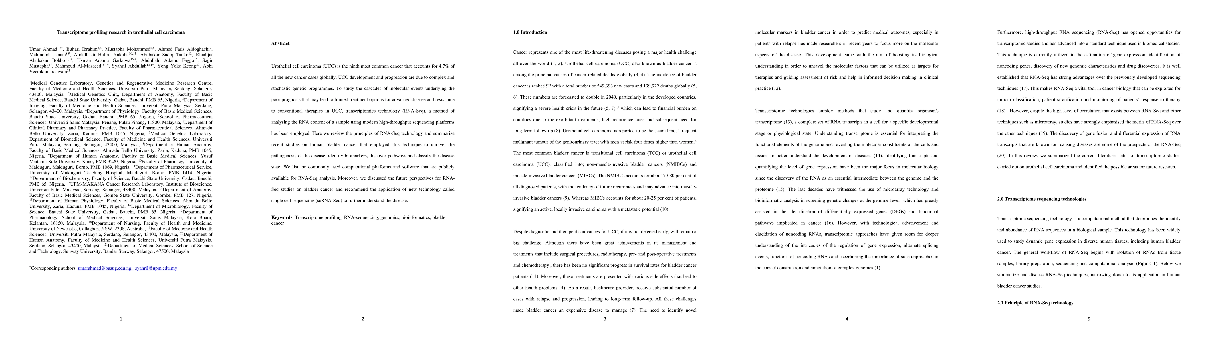 Urothelial cell carcinoma (UCC) is the ninth most common cancer that accounts for 4.7% of all the new cancer cases globally. UCC development and progression are due to complex and stochastic genetic programmes. To study the cascades of molecular events underlying the poor prognosis that may lead to limited treatment options for advanced disease and resistance to conventional therapies in UCC, transcriptomics technology (RNA-Seq), a method of analysing the RNA content of a sample using modern high-throughput sequencing platforms has been employed. Here we review the principles of RNA-Seq technology and summarize recent studies on human bladder cancer that employed this technique to unravel the pathogenesis of the disease, identify biomarkers, discover pathways and classify the disease state. We list the commonly used computational platforms and software that are publicly available for RNA-Seq analysis. Moreover, we discussed the future perspectives for RNA-Seq studies on bladder cancer and recommend the application of new technology called single cell sequencing (scRNA-Seq) to further understand the disease. Keywords: Transcriptome profiling, RNA-sequencing, genomics, bioinformatics, bladder cancer