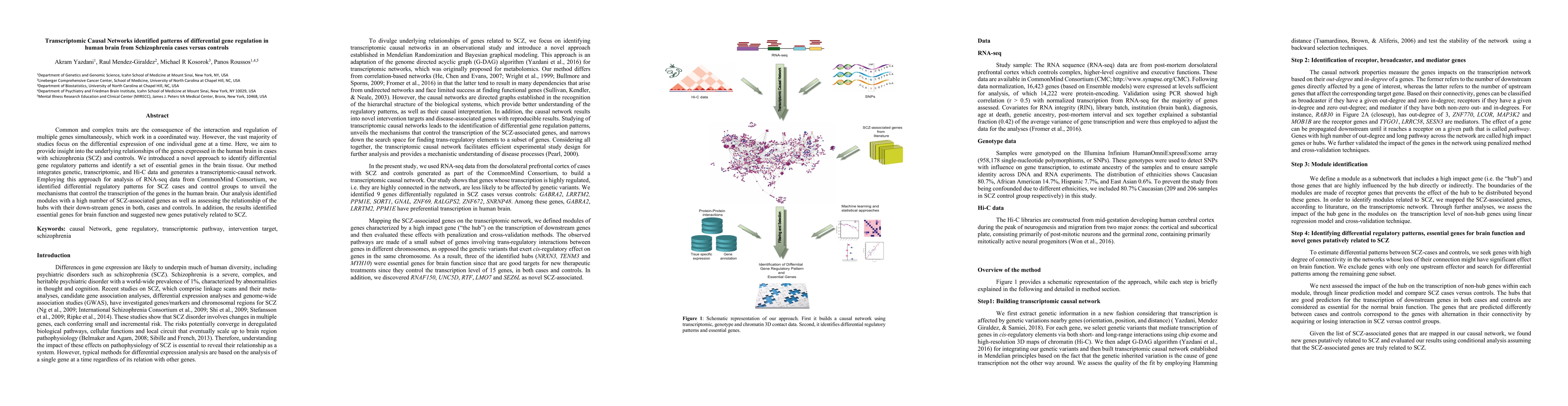 This study employs a novel transcriptomic-causal network approach to identify differential gene regulation patterns in the human brain between schizophrenia cases and controls, revealing essential genes and potential new genes associated with schizophrenia. The method integrates genetic, transcriptomic, and Hi-C data to uncover the underlying gene interaction mechanisms.