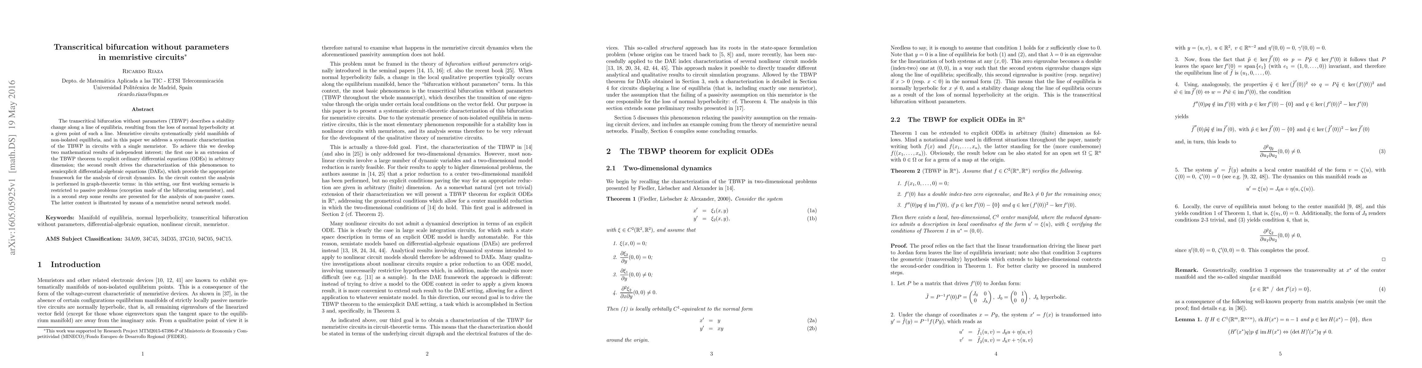 The transcritical bifurcation without parameters (TBWP) describes a stability change along a line of equilibria, resulting from the loss of normal hyperbolicity at a given point of such a line. Memristive circuits systematically yield manifolds of non-isolated equilibria, and in this paper we address a systematic characterization of the TBWP in circuits with a single memristor. To achieve this we develop two mathematical results of independent interest; the first one is an extension of the TBWP theorem to explicit ordinary differential equations (ODEs) in arbitrary dimension; the second result drives the characterization of this phenomenon to semiexplicit differential-algebraic equations (DAEs), which provide the appropriate framework for the analysis of circuit dynamics. In the circuit context the analysis is performed in graph-theoretic terms: in this setting, our first working scenario is restricted to passive problems (exception made of the bifurcating memristor), and in a second step some results are presented for the analysis of non-passive cases. The latter context is illustrated by means of a memristive neural network model.