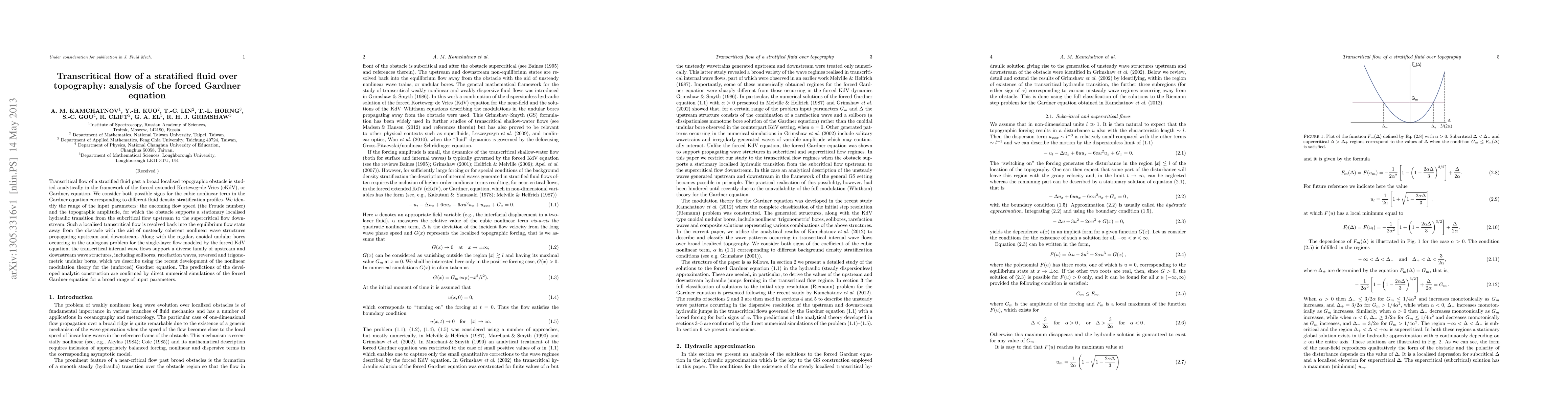 This paper analyzes the transcritical flow of a stratified fluid over topography using the forced Gardner equation, identifying conditions under which a stationary hydraulic transition occurs. It explores various wave structures, including cnoidal undular bores, solibores, and rarefaction waves, and validates the findings with numerical simulations.