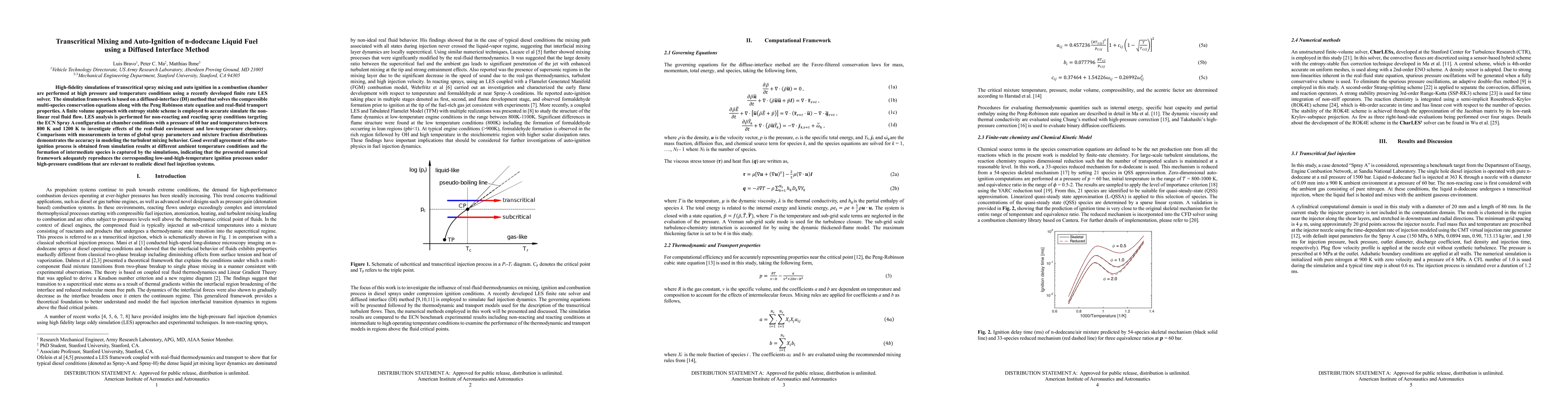 This paper presents high-fidelity simulations of n-dodecane fuel mixing and auto-ignition under transcritical conditions using a diffused-interface method and a finite rate LES solver. The framework accurately models turbulent mixing and auto-ignition processes, showing good agreement with experimental data and capturing intermediate species formation.