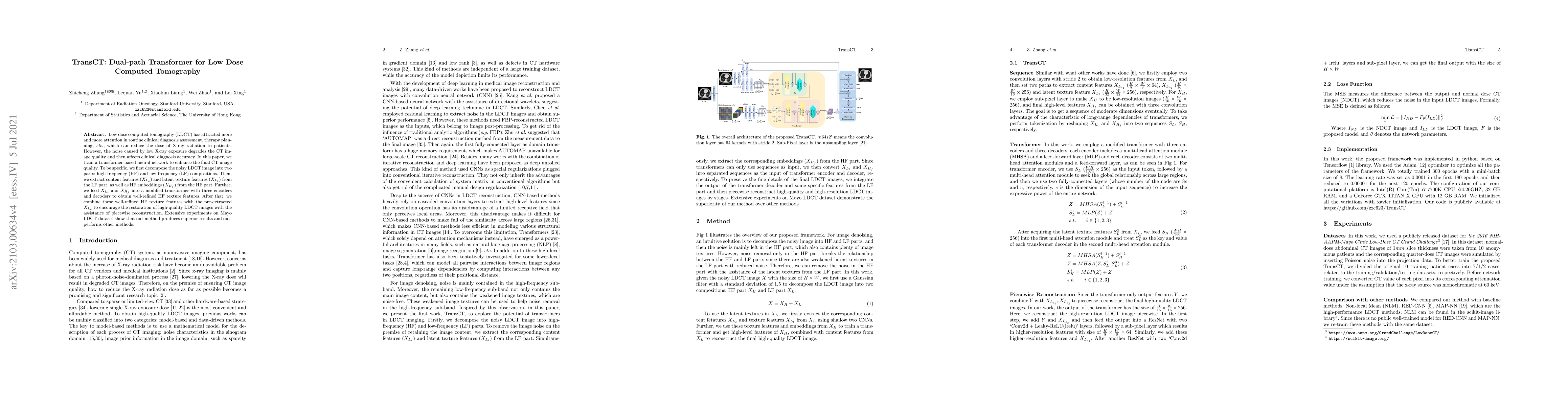 This paper proposes a dual-path transformer network, TransCT, to enhance the quality of low dose computed tomography (LDCT) images. The method decomposes the noisy LDCT image into high-frequency and low-frequency components, refines features using a modified transformer, and combines them for high-quality reconstruction, outperforming other methods on the Mayo LDCT dataset.