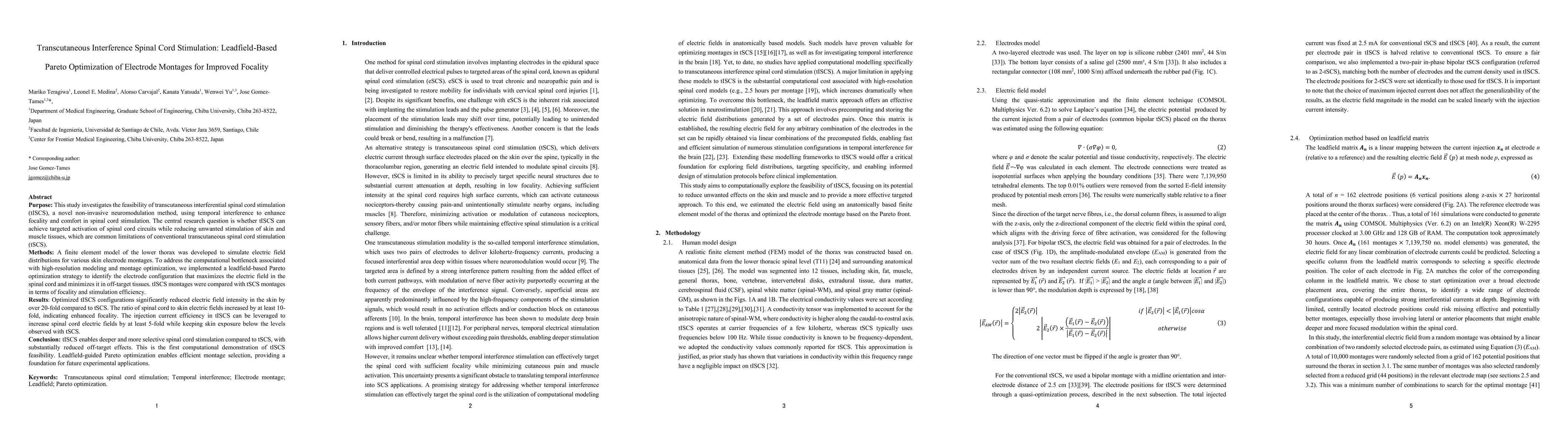 This study developed a finite element model of the lower thorax to simulate electric field distributions for various skin electrode montages. A leadfield-based Pareto optimization strategy was implemented to identify the electrode configuration that maximizes the electric field in the spinal cord and minimizes it in off-target tissues.