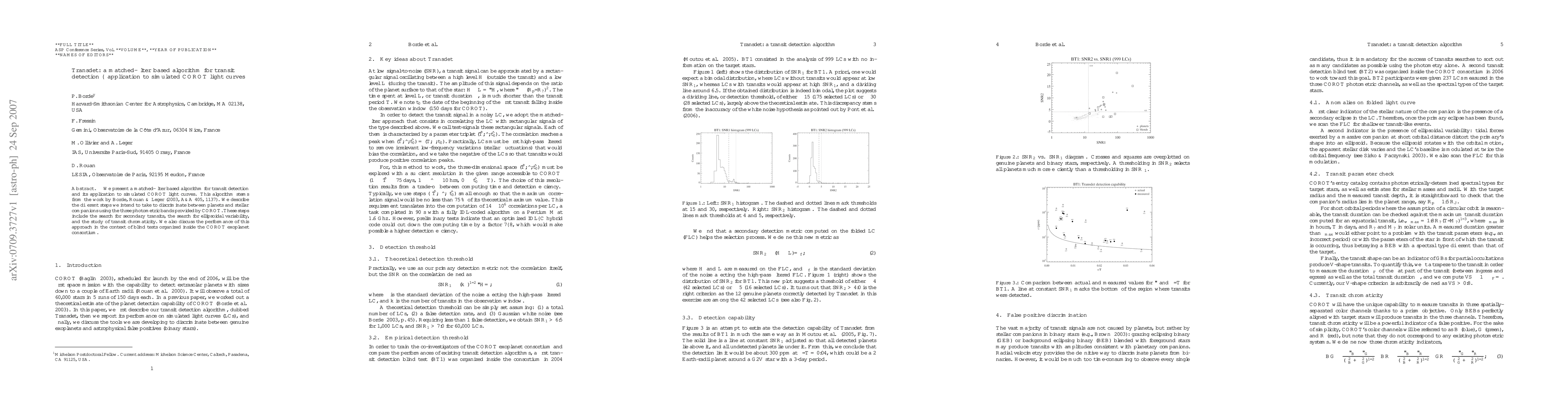 Title: Transdet: a matched-filter based algorithm for transit detection - application to simulated COROT light curves Summary: This paper introduces a matched-filter algorithm for detecting exoplanetary transits, applied to simulated COROT data, and outlines methods to distinguish between planets and stellar companions using COROT’s three photometric bands. The performance of the algorithm is evaluated through internal blind tests.