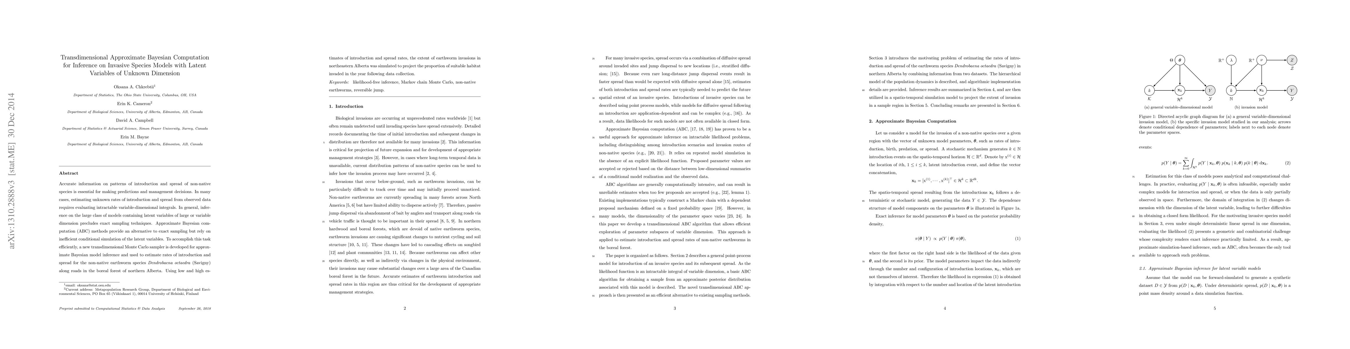 Accurate information on patterns of introduction and spread of non-native species is essential for making predictions and management decisions. In many cases, estimating unknown rates of introduction and spread from observed data requires evaluating intractable variable-dimensional integrals. In general, inference on the large class of models containing latent variables of large or variable dimension precludes exact sampling techniques. Approximate Bayesian computation (ABC) methods provide an alternative to exact sampling but rely on inefficient conditional simulation of the latent variables. To accomplish this task efficiently, a new transdimensional Monte Carlo sampler is developed for approximate Bayesian model inference and used to estimate rates of introduction and spread for the non-native earthworm species Dendrobaena octaedra (Savigny) along roads in the boreal forest of northern Alberta. Using low and high estimates of introduction and spread rates, the extent of earthworm invasions in northeastern Alberta was simulated to project the proportion of suitable habitat invaded in the year following data collection.