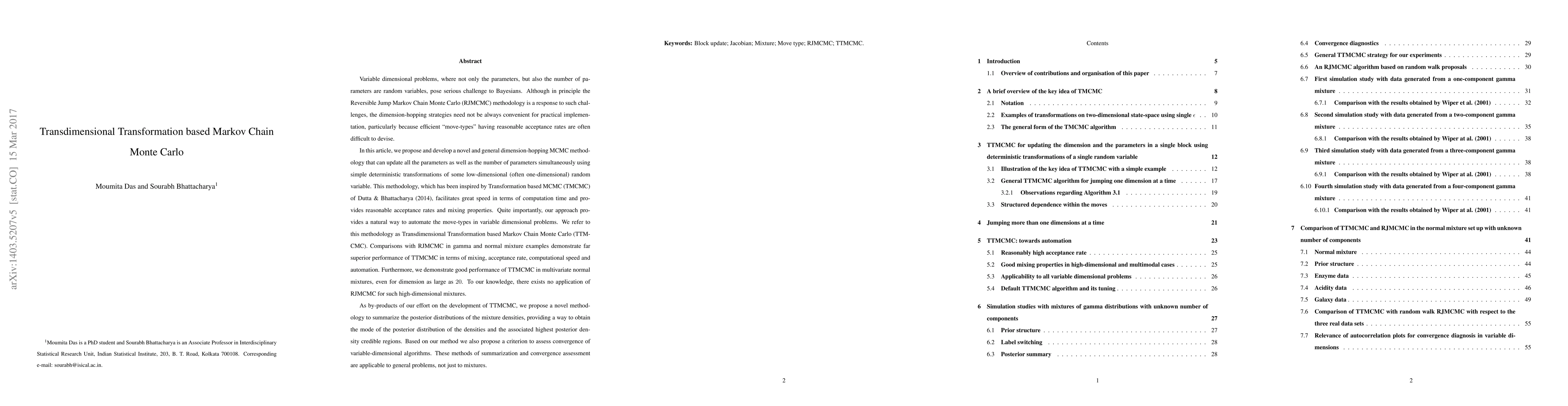 This paper introduces a novel Transdimensional Transformation based Markov Chain Monte Carlo (TTMCMC) methodology that allows simultaneous updating of all parameters and the number of parameters using low-dimensional transformations. It demonstrates superior performance compared to RJMCMC in terms of mixing, acceptance rate, computational speed, and automation, and is effective for high-dimensional mixtures. The paper also proposes methods for summarizing posterior distributions and assessing convergence in variable-dimensional algorithms.
