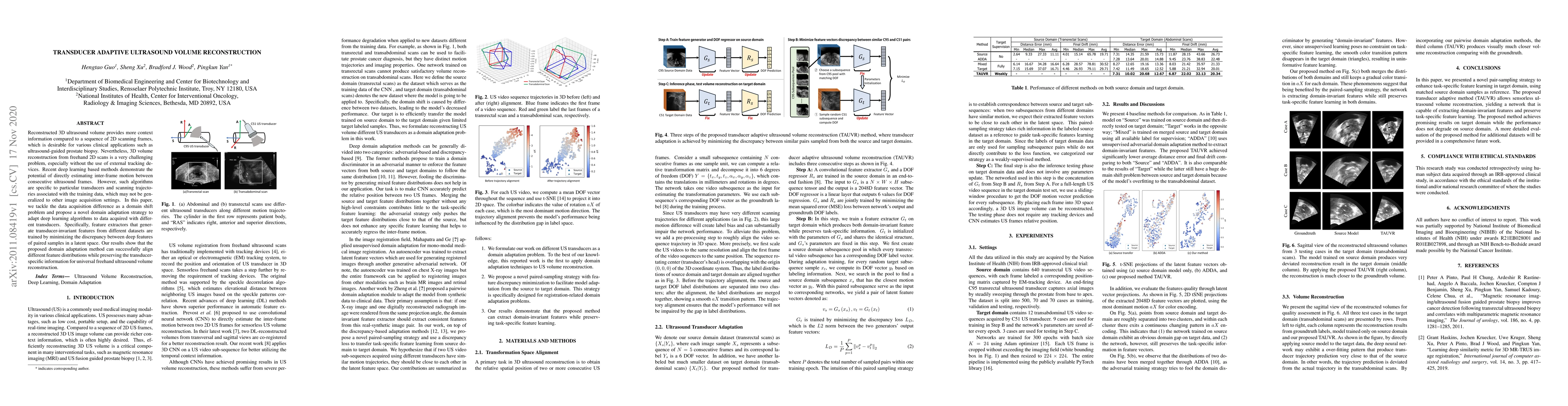This paper proposes a domain adaptation strategy to enable deep learning algorithms for reconstructing 3D ultrasound volumes from freehand 2D scans, addressing the challenge of transducer-specific data acquisition differences. The method trains feature extractors that generate transducer-invariant features, successfully aligning different feature distributions for universal volume reconstruction.