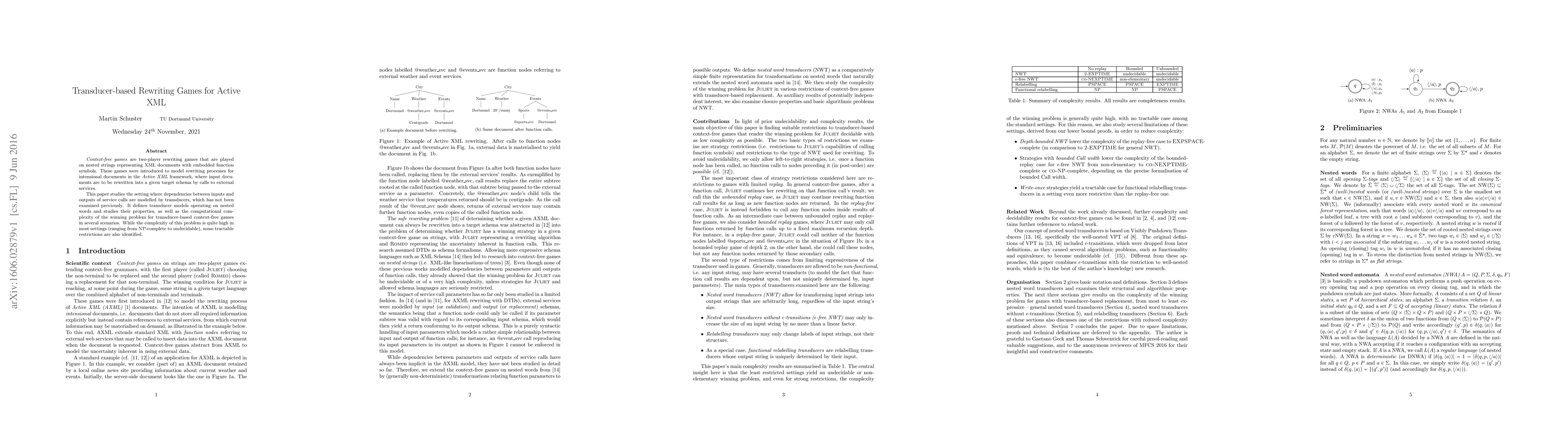 Context-free games are two-player rewriting games that are played on nested strings representing XML documents with embedded function symbols. These games were introduced to model rewriting processes for intensional documents in the Active XML framework, where input documents are to be rewritten into a given target schema by calls to external services. This paper studies the setting where dependencies between inputs and outputs of service calls are modelled by transducers, which has not been examined previously. It defines transducer models operating on nested words and studies their properties, as well as the computational complexity of the winning problem for transducer-based context-free games in several scenarios. While the complexity of this problem is quite high in most settings (ranging from NP-complete to undecidable), some tractable restrictions are also identified.