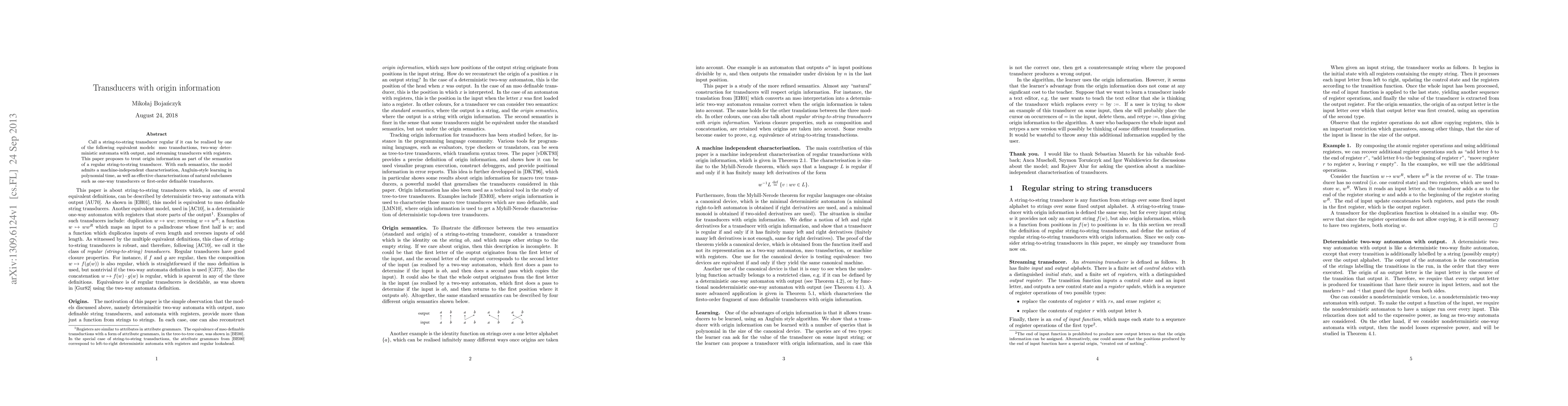 Call a string-to-string transducer regular if it can be realised by one of the following equivalent models: mso transductions, two-way deterministic automata with output, and streaming transducers with registers. This paper proposes to treat origin information as part of the semantics of a regular string-to-string transducer. With such semantics, the model admits a machine-independent characterisation, Angluin-style learning in polynomial time, as well as effective characterisations of natural subclasses such as one-way transducers or first-order definable transducers.