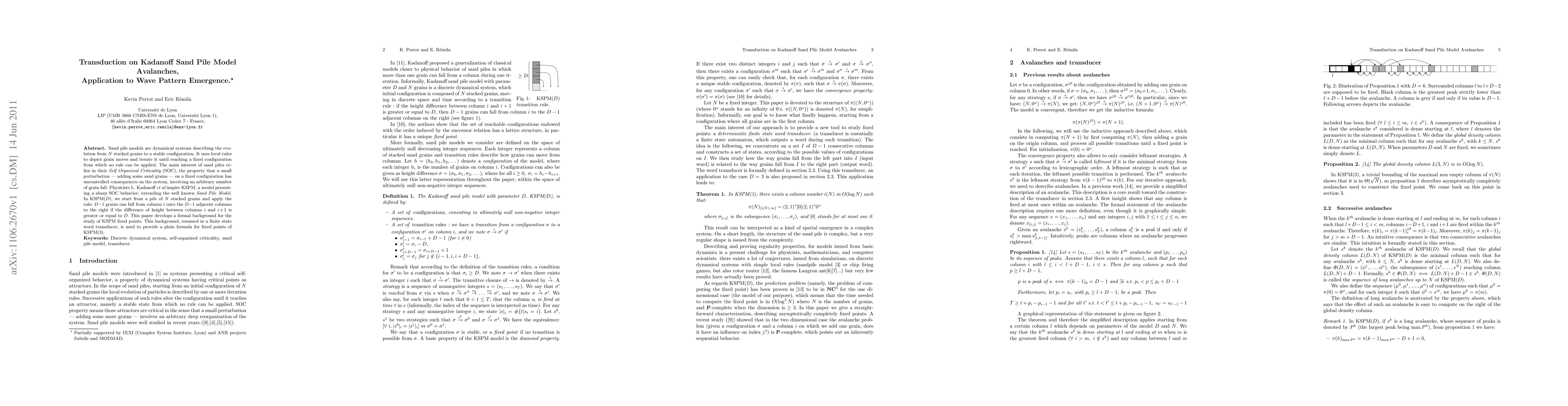 This paper explores the dynamics of the Kadanoff Sand Pile Model (KSPM) and develops a formal framework using a finite state word transducer to analyze its fixed points, specifically providing a formula for KSPM(3). The study highlights the model's self-organized criticality and its application to wave pattern emergence.