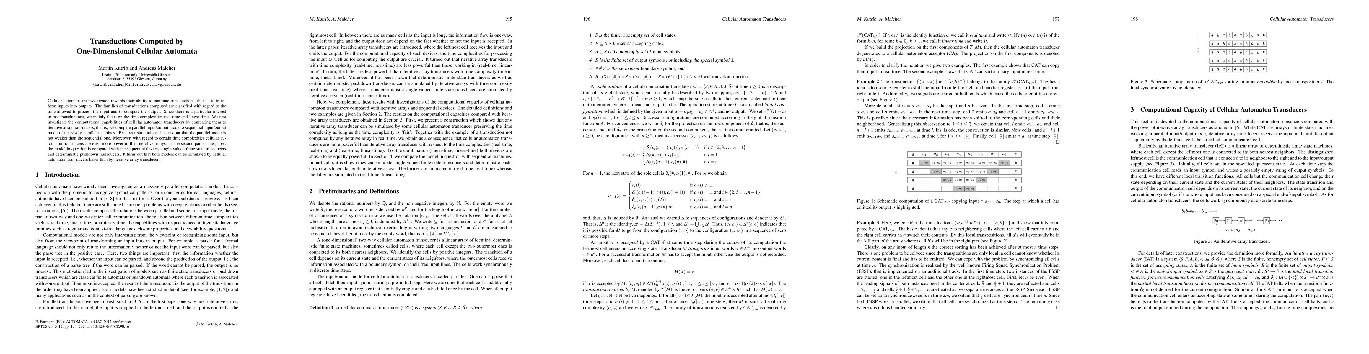 This research paper investigates cellular automata's ability to compute transductions in real-time and linear time, finding they surpass iterative array transducers in certain complexities and can simulate sequential devices faster.