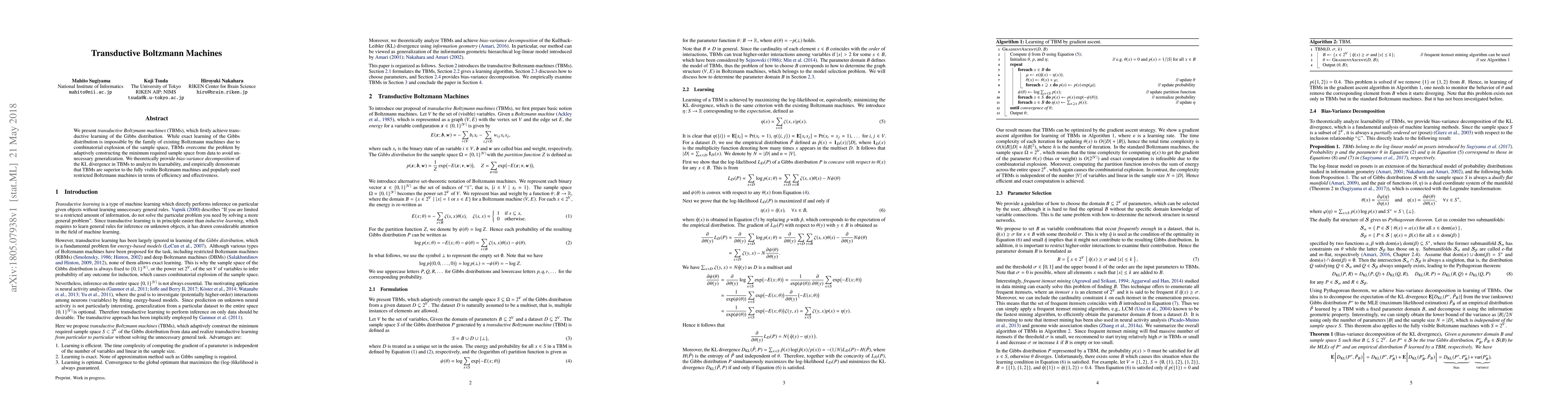 We present transductive Boltzmann machines (TBMs), which firstly achieve transductive learning of the Gibbs distribution. While exact learning of the Gibbs distribution is impossible by the family of existing Boltzmann machines due to combinatorial explosion of the sample space, TBMs overcome the problem by adaptively constructing the minimum required sample space from data to avoid unnecessary generalization. We theoretically provide bias-variance decomposition of the KL divergence in TBMs to analyze its learnability, and empirically demonstrate that TBMs are superior to the fully visible Boltzmann machines and popularly used restricted Boltzmann machines in terms of efficiency and effectiveness.