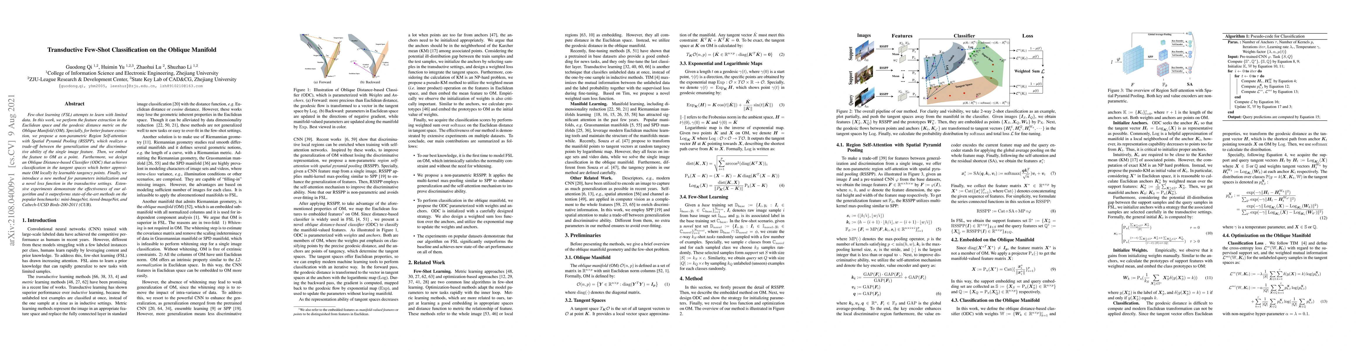 Few-shot learning (FSL) attempts to learn with limited data. In this work, we perform the feature extraction in the Euclidean space and the geodesic distance metric on the Oblique Manifold (OM). Specially, for better feature extraction, we propose a non-parametric Region Self-attention with Spatial Pyramid Pooling (RSSPP), which realizes a trade-off between the generalization and the discriminative ability of the single image feature. Then, we embed the feature to OM as a point. Furthermore, we design an Oblique Distance-based Classifier (ODC) that achieves classification in the tangent spaces which better approximate OM locally by learnable tangency points. Finally, we introduce a new method for parameters initialization and a novel loss function in the transductive settings. Extensive experiments demonstrate the effectiveness of our algorithm and it outperforms state-of-the-art methods on the popular benchmarks: mini-ImageNet, tiered-ImageNet, and Caltech-UCSD Birds-200-2011 (CUB).