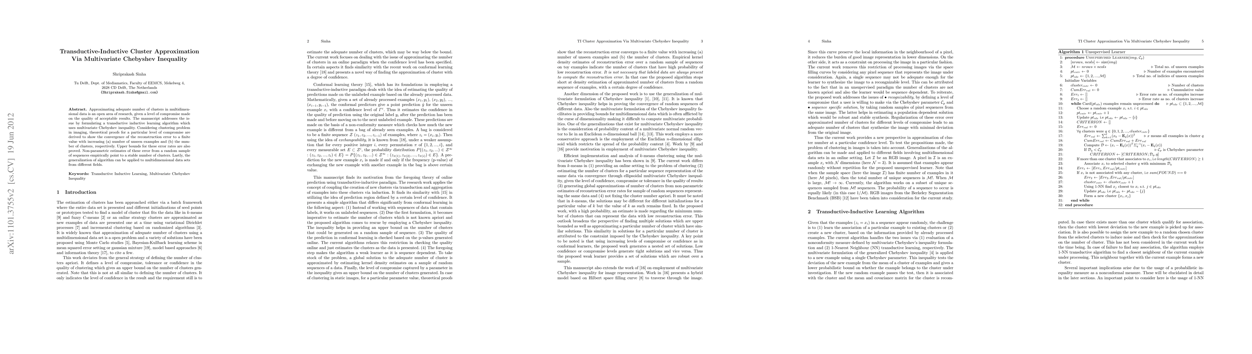 Approximating adequate number of clusters in multidimensional data is an open area of research, given a level of compromise made on the quality of acceptable results. The manuscript addresses the issue by formulating a transductive inductive learning algorithm which uses multivariate Chebyshev inequality. Considering clustering problem in imaging, theoretical proofs for a particular level of compromise are derived to show the convergence of the reconstruction error to a finite value with increasing (a) number of unseen examples and (b) the number of clusters, respectively. Upper bounds for these error rates are also proved. Non-parametric estimates of these error from a random sample of sequences empirically point to a stable number of clusters. Lastly, the generalization of algorithm can be applied to multidimensional data sets from different fields.