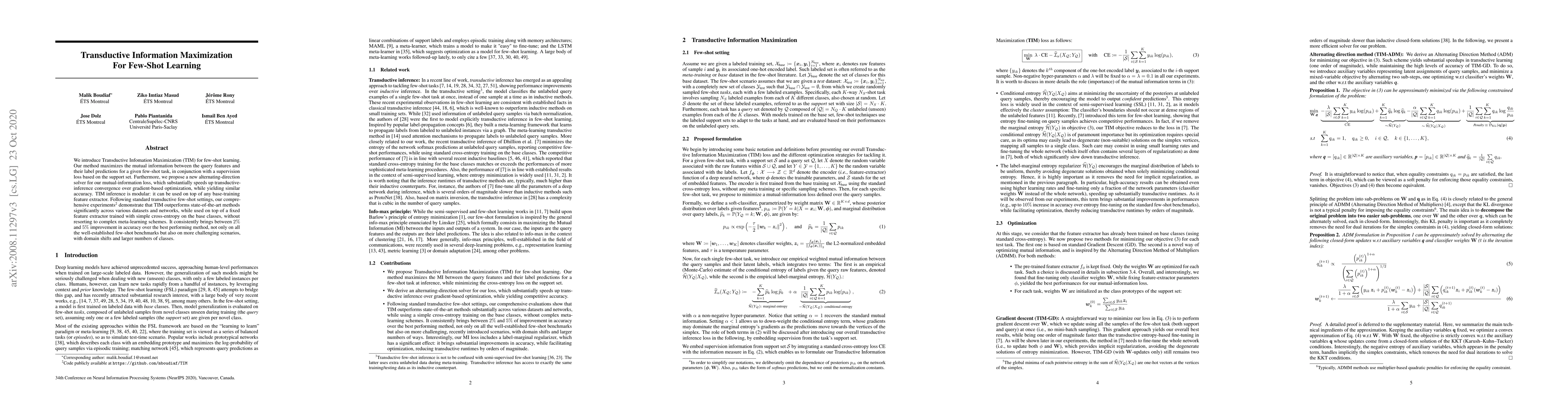 This paper introduces Transductive Information Maximization (TIM) for few-shot learning, which maximizes mutual information between query features and label predictions, achieving significant accuracy improvements over state-of-the-art methods across various datasets and scenarios, without complex meta-learning.
