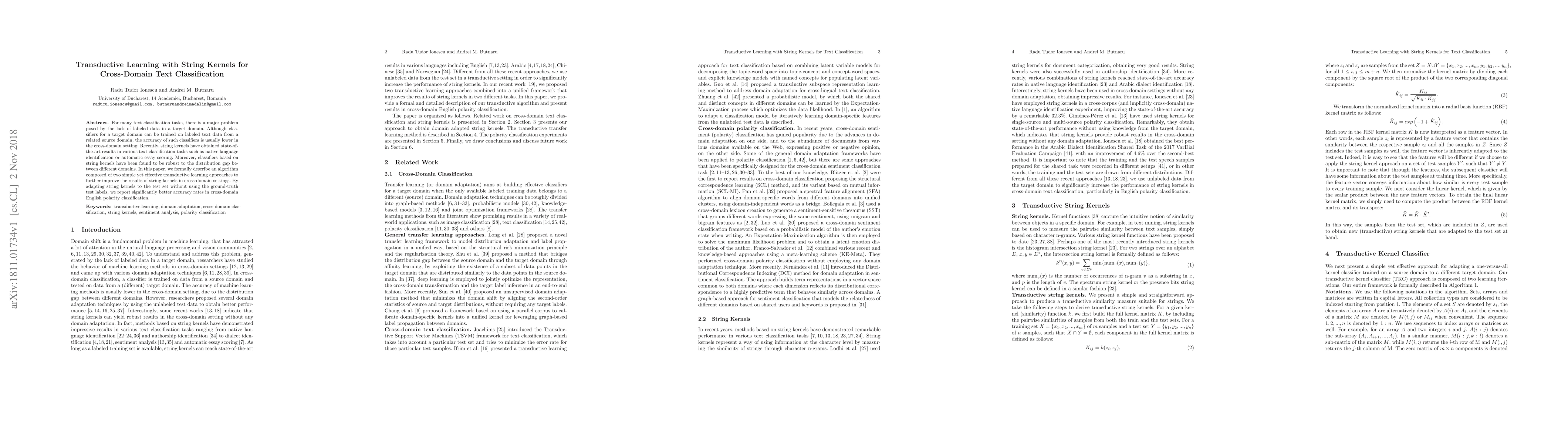 This paper proposes a method to improve cross-domain text classification accuracy using string kernels with transductive learning approaches, achieving better results in English polarity classification.