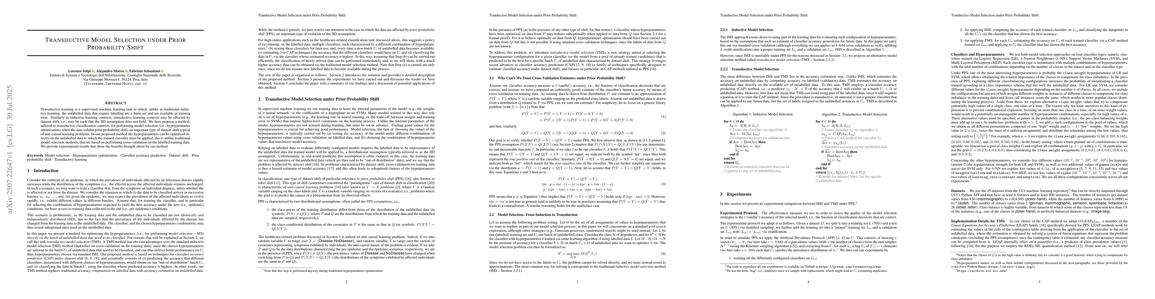 This work introduces TMS, a novel approach for hyperparameter optimization in transductive learning tasks affected by prior probability shift, differentiating itself from traditional inductive model selection methods that rely on cross-validation on labeled training data.