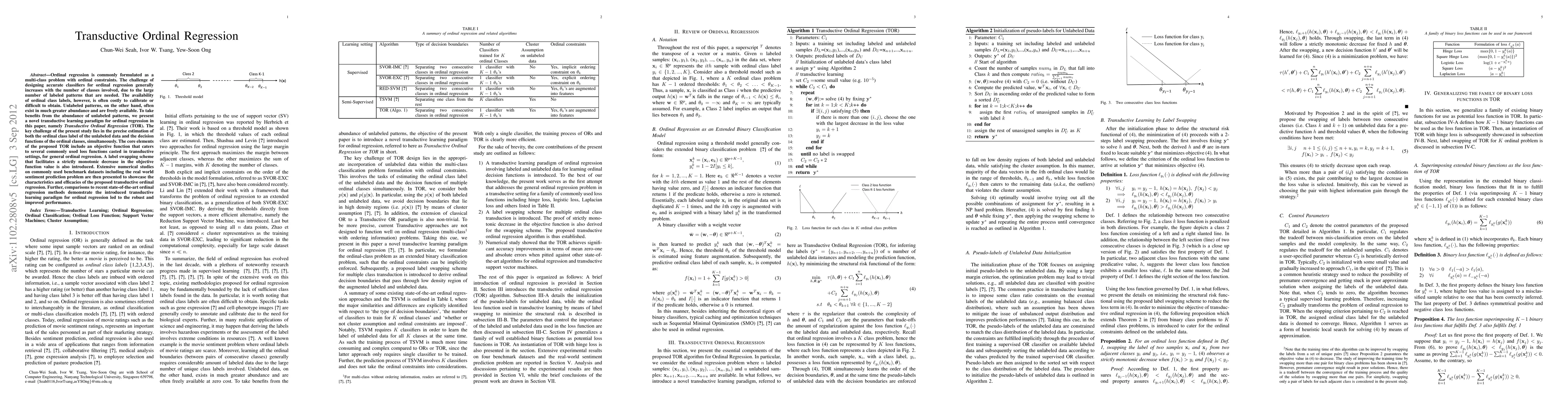 The paper proposes a transductive learning framework for ordinal regression, TOR, which incorporates a label swapping scheme to ensure a strictly monotonic decrease in the objective function value, supporting various ordinal loss functions.