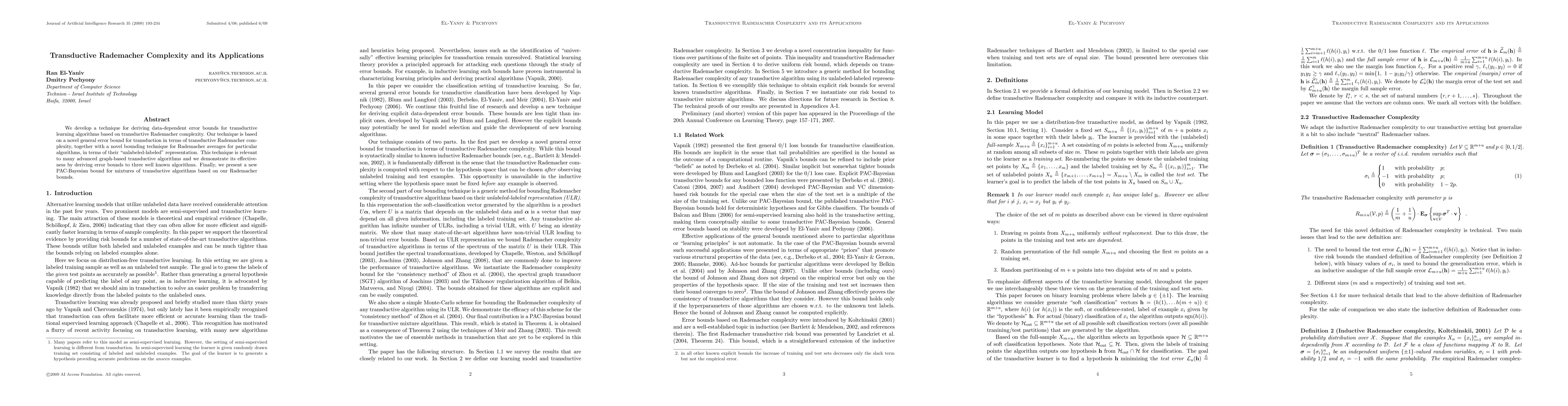This paper introduces a new method for deriving data-dependent error bounds for transductive learning algorithms using transductive Rademacher complexity, demonstrating its effectiveness for several advanced graph-based algorithms and presenting a new PAC-Bayesian bound for mixtures of transductive algorithms.