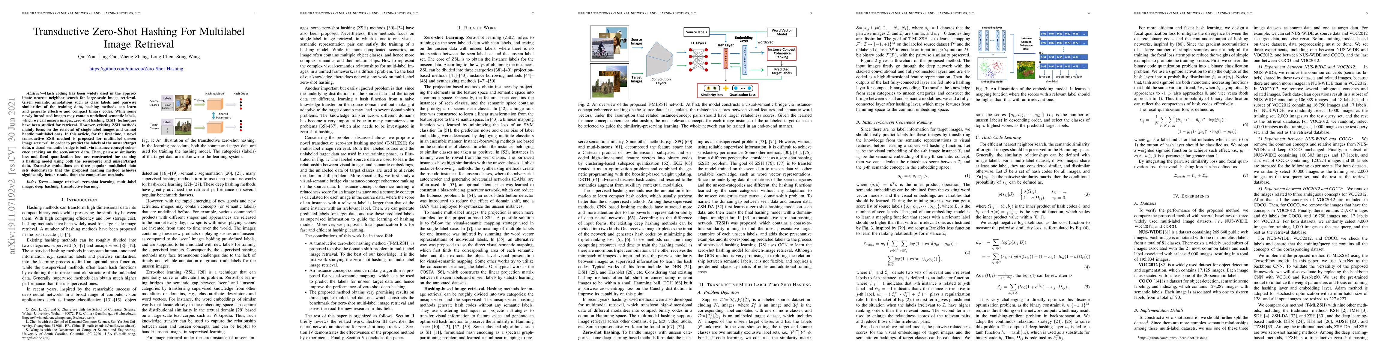 This paper proposes a novel transductive zero-shot hashing method for multi-label image retrieval, enabling effective retrieval of images with undefined semantic labels. It constructs a visual-semantic bridge and uses pairwise similarity loss and focal quantization loss to train the hashing model, achieving superior performance on multi-label datasets.