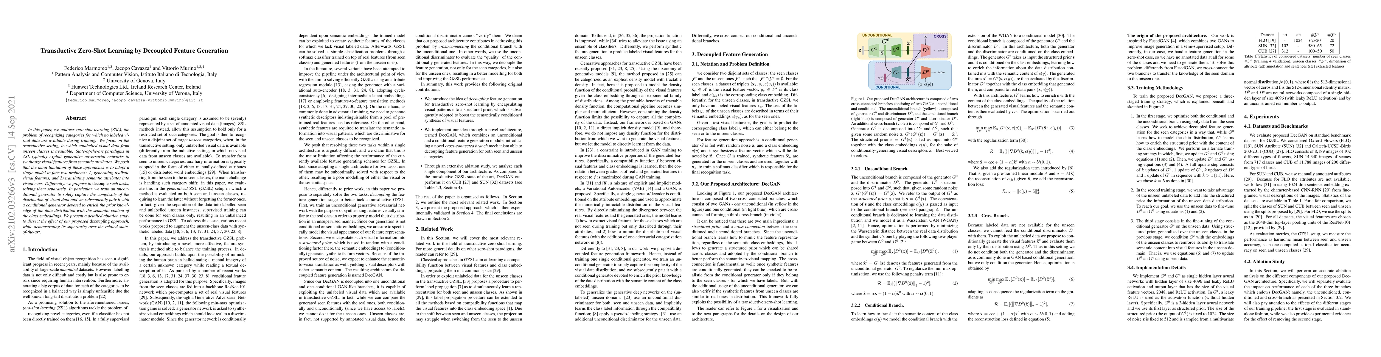 In this paper, we address zero-shot learning (ZSL), the problem of recognizing categories for which no labeled visual data are available during training. We focus on the transductive setting, in which unlabelled visual data from unseen classes is available. State-of-the-art paradigms in ZSL typically exploit generative adversarial networks to synthesize visual features from semantic attributes. We posit that the main limitation of these approaches is to adopt a single model to face two problems: 1) generating realistic visual features, and 2) translating semantic attributes into visual cues. Differently, we propose to decouple such tasks, solving them separately. In particular, we train an unconditional generator to solely capture the complexity of the distribution of visual data and we subsequently pair it with a conditional generator devoted to enrich the prior knowledge of the data distribution with the semantic content of the class embeddings. We present a detailed ablation study to dissect the effect of our proposed decoupling approach, while demonstrating its superiority over the related state-of-the-art.