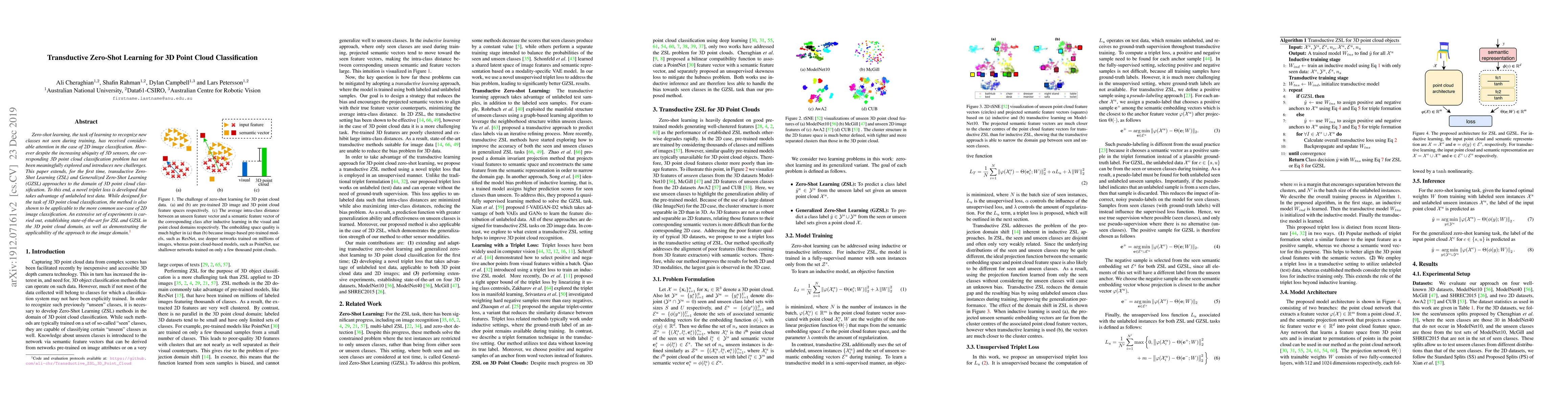 Zero-shot learning, the task of learning to recognize new classes not seen during training, has received considerable attention in the case of 2D image classification. However despite the increasing ubiquity of 3D sensors, the corresponding 3D point cloud classification problem has not been meaningfully explored and introduces new challenges. This paper extends, for the first time, transductive Zero-Shot Learning (ZSL) and Generalized Zero-Shot Learning (GZSL) approaches to the domain of 3D point cloud classification. To this end, a novel triplet loss is developed that takes advantage of unlabeled test data. While designed for the task of 3D point cloud classification, the method is also shown to be applicable to the more common use-case of 2D image classification. An extensive set of experiments is carried out, establishing state-of-the-art for ZSL and GZSL in the 3D point cloud domain, as well as demonstrating the applicability of the approach to the image domain.