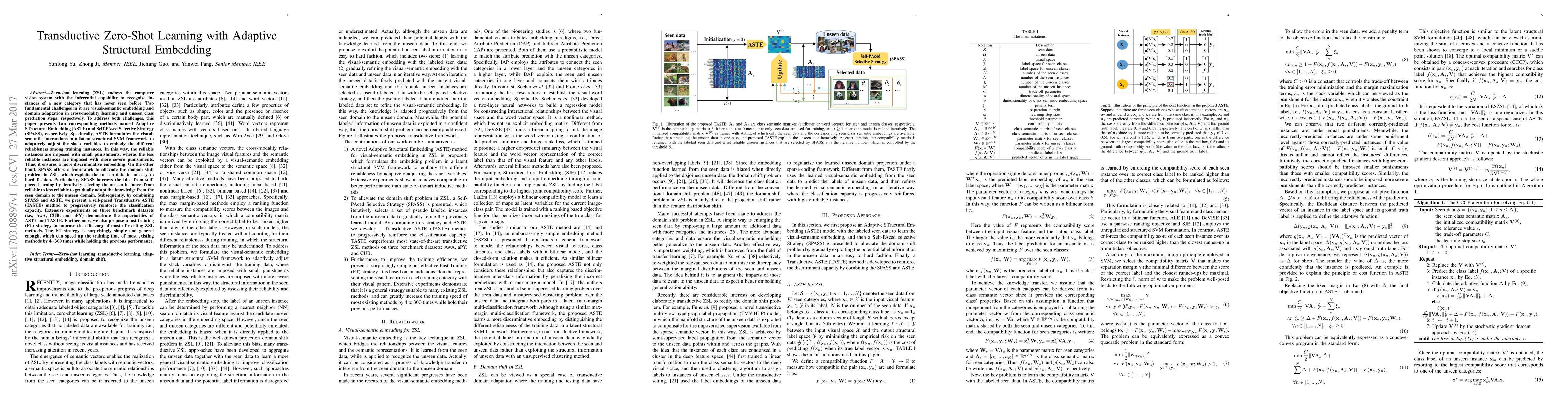 This paper proposes two methods for zero-shot learning: Adaptive Structural Embedding (ASTE) to improve visual-semantic embedding, and Self-Paced Selective Strategy (SPASS) to alleviate domain shift. The combination of these methods yields superior performance on three benchmark datasets.