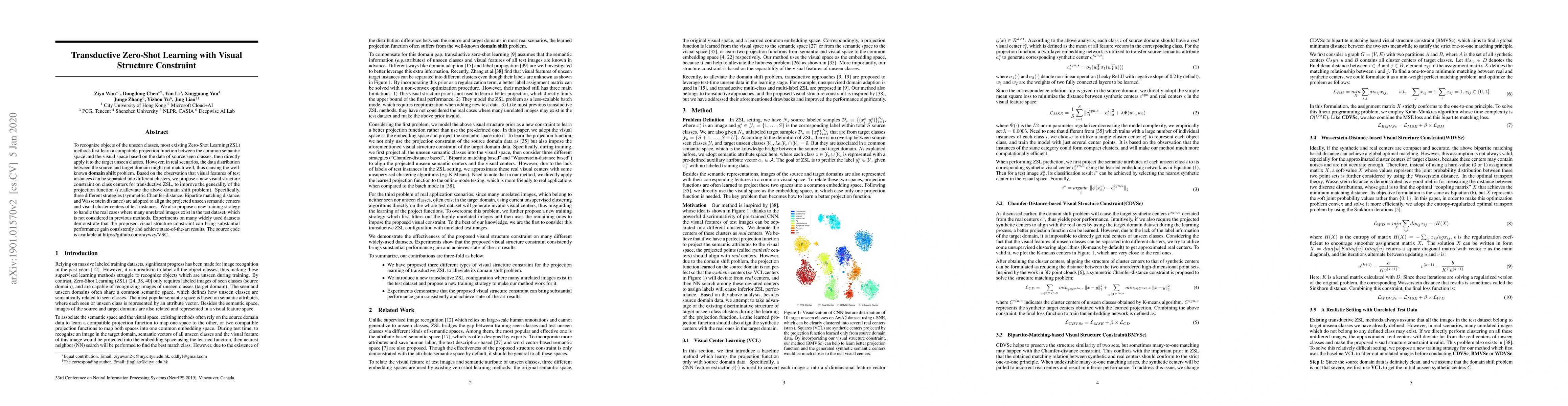 This paper proposes a new visual structure constraint for transductive Zero-Shot Learning to address the domain shift problem by aligning projected unseen semantic centers with visual cluster centers using three different strategies. The method achieves state-of-the-art results on multiple datasets and handles cases with unrelated test images.